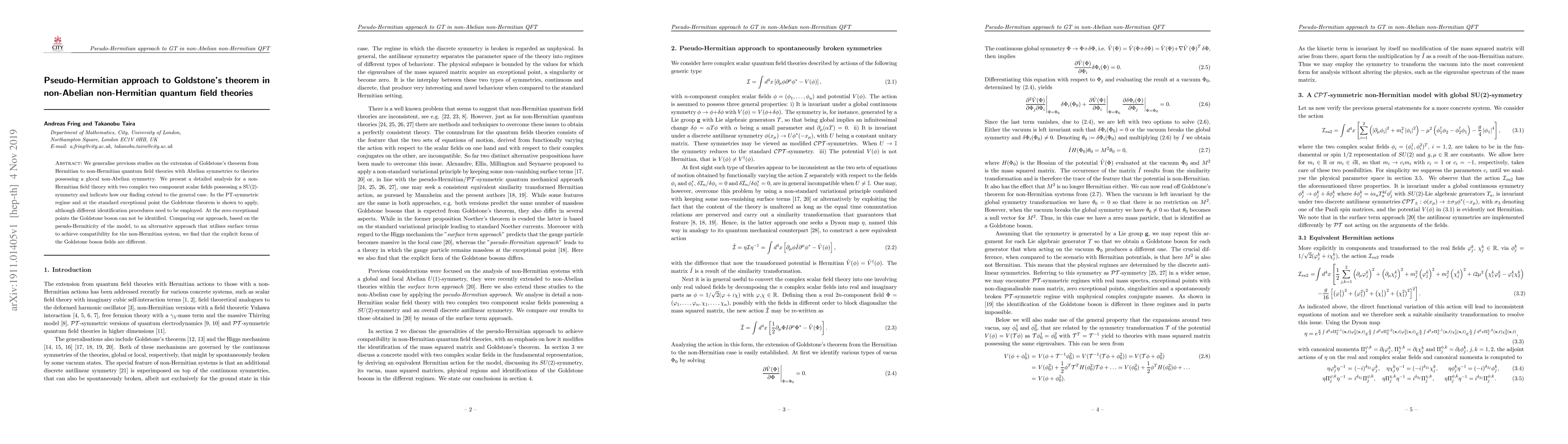 This paper extends Goldstone's theorem to non-Abelian non-Hermitian quantum field theories using a pseudo-Hermitian approach, demonstrating its applicability in the PT-symmetric regime, while highlighting differences in the identification of Goldstone bosons compared to an alternative method that uses surface terms.