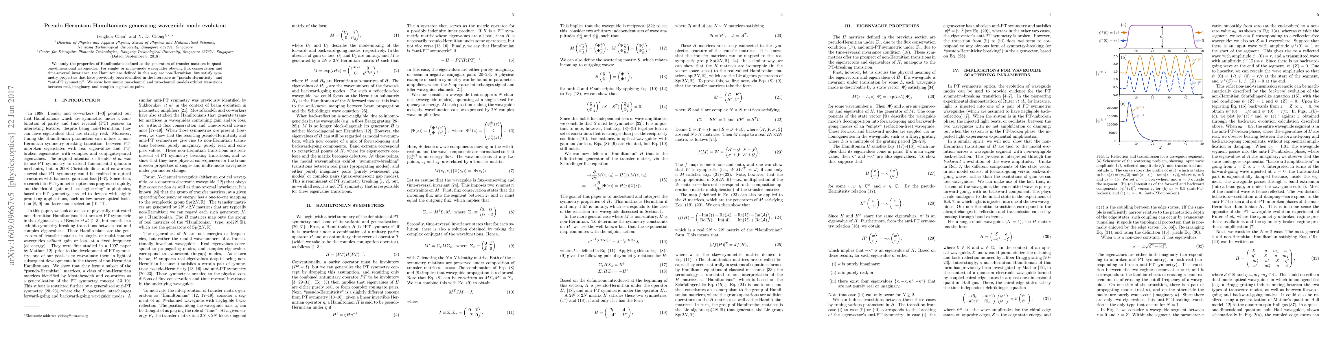 We study the properties of Hamiltonians defined as the generators of transfer matrices in quasi- one-dimensional waveguides. For single- or multi-mode waveguides obeying flux conservation and time-reversal invariance, the Hamiltonians defined in this way are non-Hermitian, but satisfy symmetry properties that have previously been identified in the literature as "pseudo Hermiticity" and "anti-PT symmetry". We show how simple one-channel and two-channel models exhibit transitions between real, imaginary, and complex eigenvalue pairs.