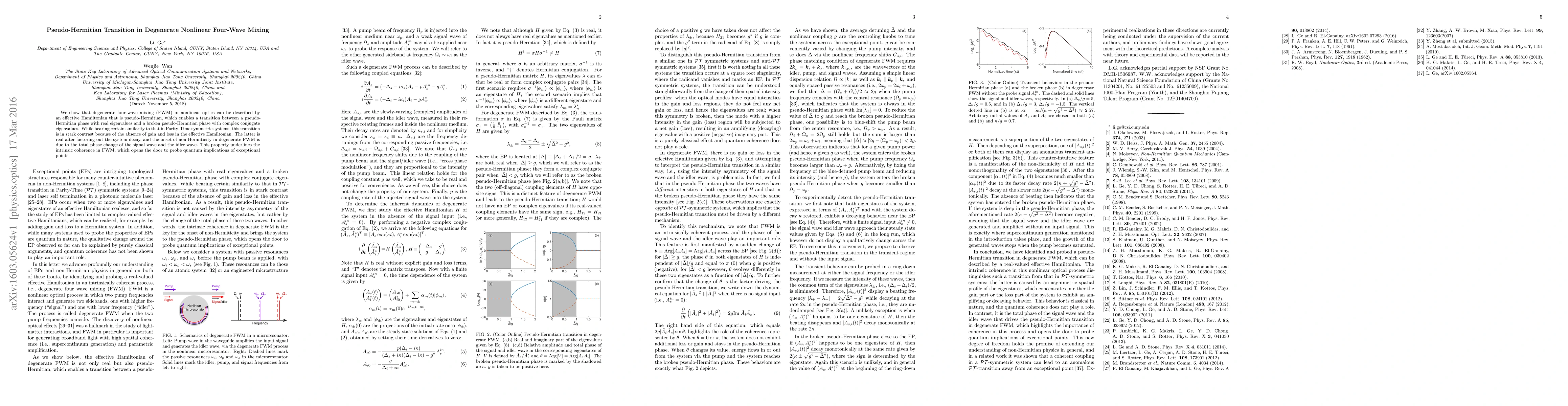 We show that degenerate four-wave mixing (FWM) in nonlinear optics can be described by an effective Hamiltonian that is pseudo-Hermitian, which enables a transition between a pseudo-Hermitian phase with real eigenvalues and a broken pseudo-Hermitian phase with complex conjugate eigenvalues. While bearing certain similarity to that in Parity-Time symmetric systems, this transition is in stark contrast because of the absence of gain and loss in the effective Hamiltonian. The latter is real after factoring out the system decay, and the onset of non-Hermiticity in degenerate FWM is due to the total phase change of the signal wave and the idler wave. This property underlines the intrinsic coherence in FWM, which opens the door to probe quantum implications of exceptional points.
