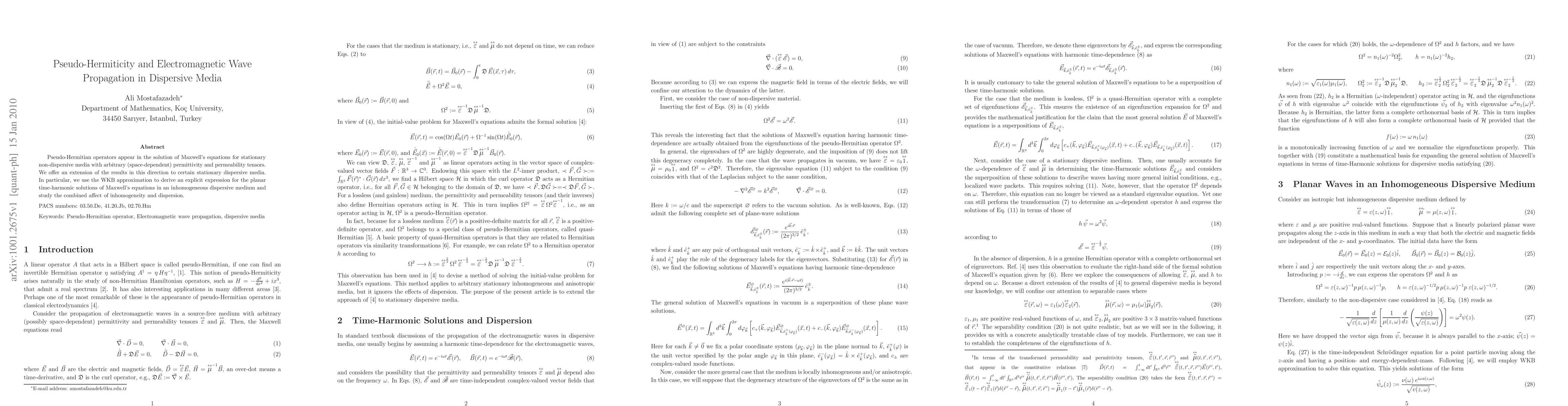 This paper extends the application of pseudo-Hermitian operators to Maxwell's equations in stationary dispersive media, utilizing the WKB approximation to derive explicit planar time-harmonic solutions, and examines the effects of inhomogeneity and dispersion on electromagnetic wave propagation.