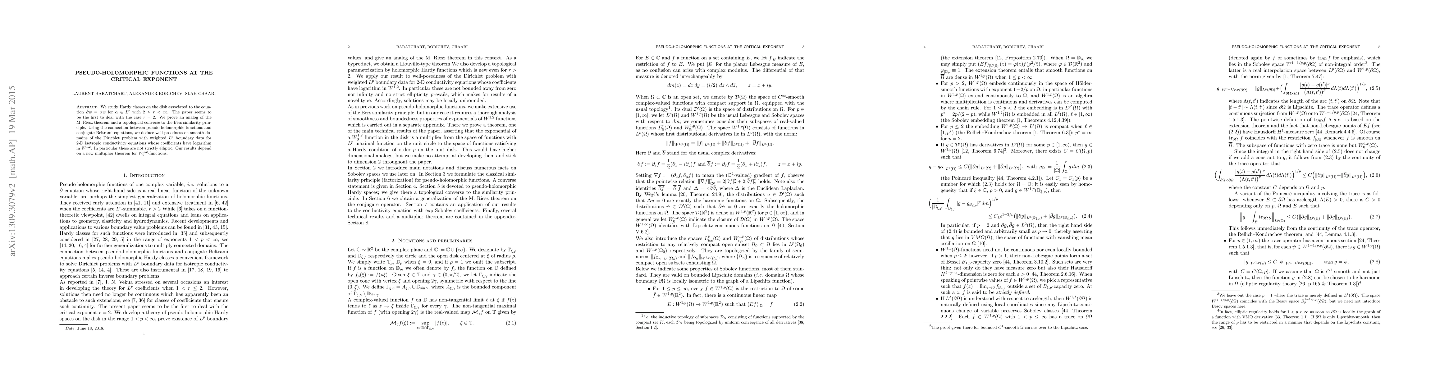 We study Hardy classes on the disk associated to the equation $\bar\d w=\alpha\bar w$ for $\alpha\in L^r$ with $2\leq r<\infty$. The paper seems to be the first to deal with the case $r=2$. We prove an analog of the M.~Riesz theorem and a topological converse to the Bers similarity principle. Using the connection between pseudo-holomorphic functions and conjugate Beltrami equations, we deduce well-posedness on smooth domains of the Dirichlet problem with weighted $L^p$ boundary data for 2-D isotropic conductivity equations whose coefficients have logarithm in $W^{1,2}$. In particular these are not strictly elliptic. Our results depend on a new multiplier theorem for $W^{1,2}_0$-functions.