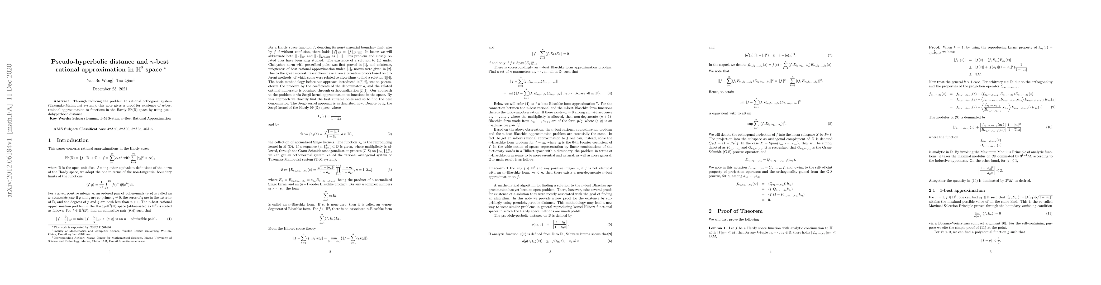 This paper proves the existence of n-best rational approximations to functions in the Hardy H2(D) space using pseudohyperbolic distance and a reduced system, enabling more accurate approximations.