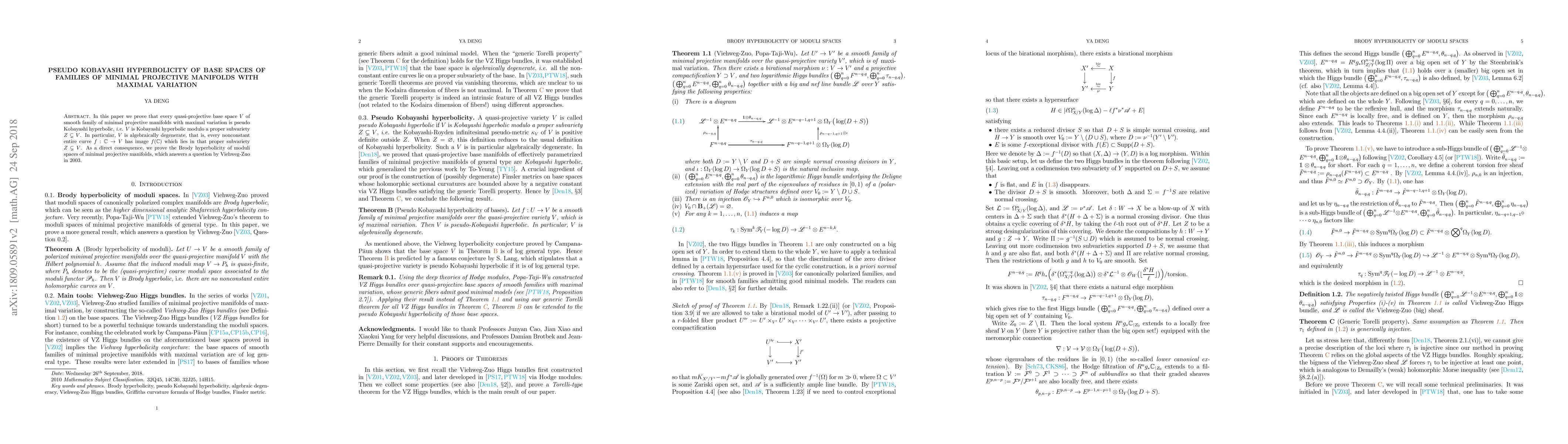 This paper demonstrates that quasi-projective base spaces of families of minimal projective manifolds with maximal variation are pseudo Kobayashi hyperbolic, implying algebraic degeneracy. Consequently, it establishes the Brody hyperbolicity of moduli spaces of such minimal projective manifolds, addressing a question posed in 2003.