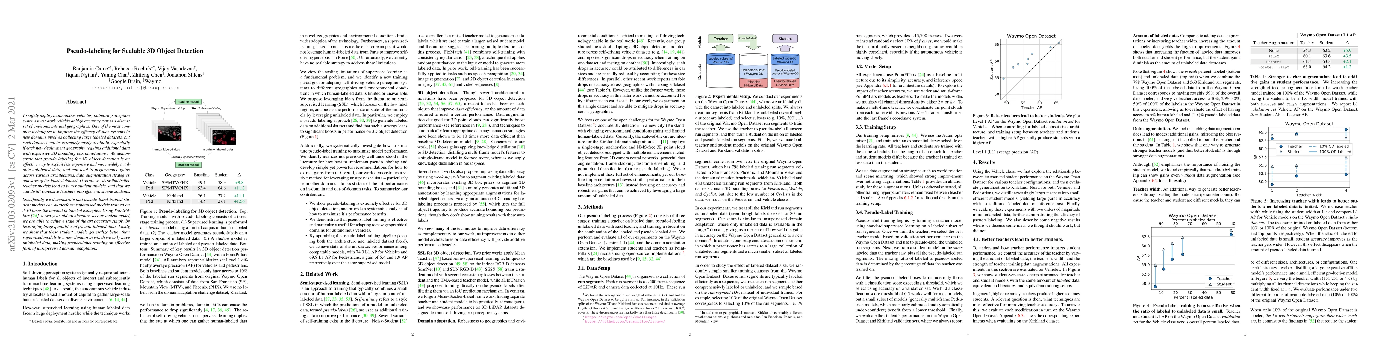 This paper explores pseudo-labeling for scalable 3D object detection in autonomous vehicles, demonstrating that it can effectively utilize unlabeled data to improve detection performance. The study shows that pseudo-label-trained models can outperform supervised models trained on larger labeled datasets, achieving state-of-the-art accuracy with minimal labeled data.