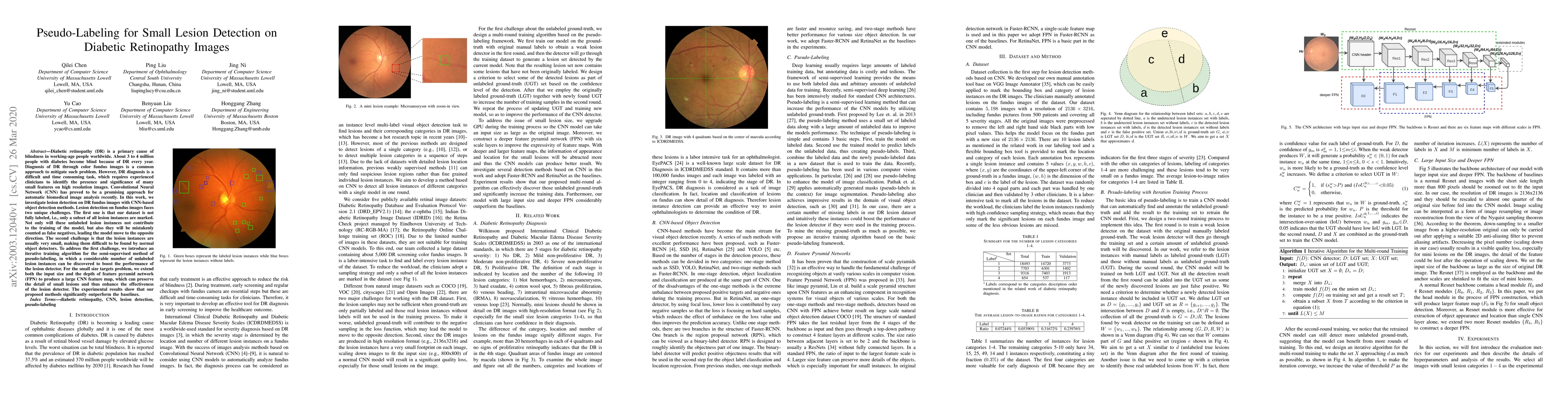 This paper investigates the use of pseudo-labeling and an enhanced feature pyramid network for detecting small lesions in diabetic retinopathy fundus images. The proposed semi-supervised method leverages unlabeled data to improve model training, while the extended CNN feature map addresses the challenge of small lesion detection, leading to superior performance compared to baselines.