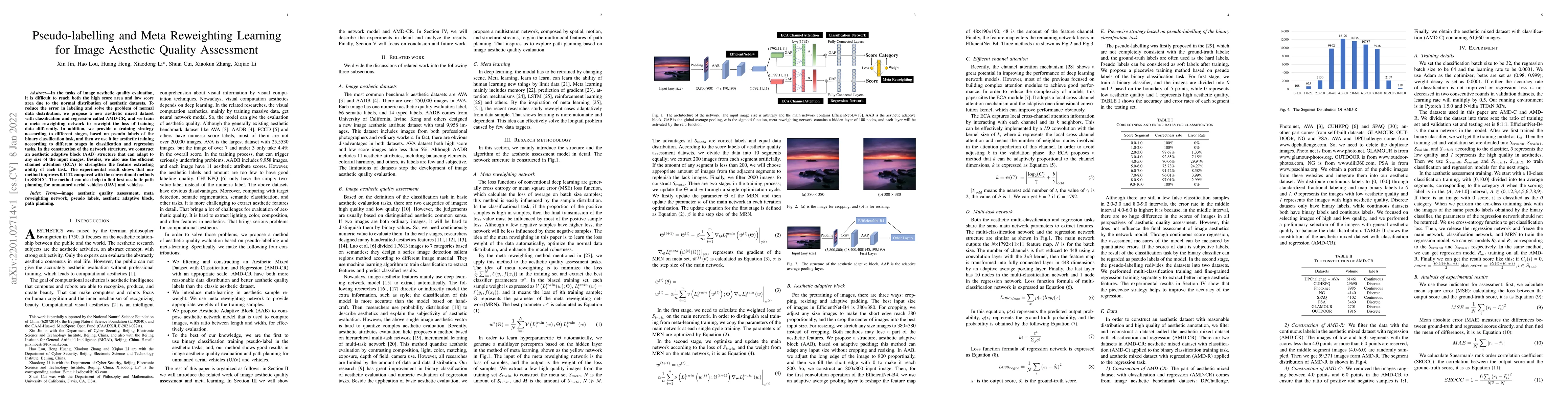 In the tasks of image aesthetic quality evaluation, it is difficult to reach both the high score area and low score area due to the normal distribution of aesthetic datasets. To reduce the error in labeling and solve the problem of normal data distribution, we propose a new aesthetic mixed dataset with classification and regression called AMD-CR, and we train a meta reweighting network to reweight the loss of training data differently. In addition, we provide a training strategy acccording to different stages, based on pseudo labels of the binary classification task, and then we use it for aesthetic training acccording to different stages in classification and regression tasks. In the construction of the network structure, we construct an aesthetic adaptive block (AAB) structure that can adapt to any size of the input images. Besides, we also use the efficient channel attention (ECA) to strengthen the feature extracting ability of each task. The experimental result shows that our method improves 0.1112 compared with the conventional methods in SROCC. The method can also help to find best aesthetic path planning for unmanned aerial vehicles (UAV) and vehicles.
