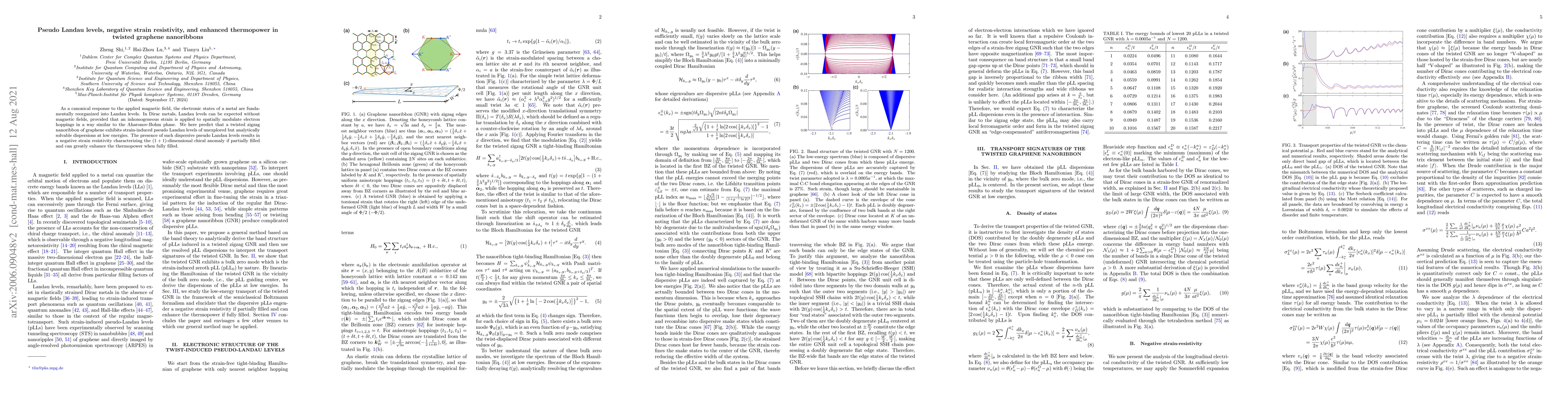 As a canonical response to the applied magnetic field, the electronic states of a metal are fundamentally reorganized into Landau levels. In Dirac metals, Landau levels can be expected without magnetic fields, provided that an inhomogeneous strain is applied to spatially modulate electron hoppings in a similar way as the Aharonov-Bohm phase. We here predict that a twisted zigzag nanoribbon of graphene exhibits strain-induced pseudo Landau levels of unexplored but analytically solvable dispersions at low energies. The presence of such dispersive pseudo Landau levels results in a negative strain resistivity characterizing the $(1+1)$-dimensional chiral anomaly if partially filled and can greatly enhance the thermopower when fully filled.