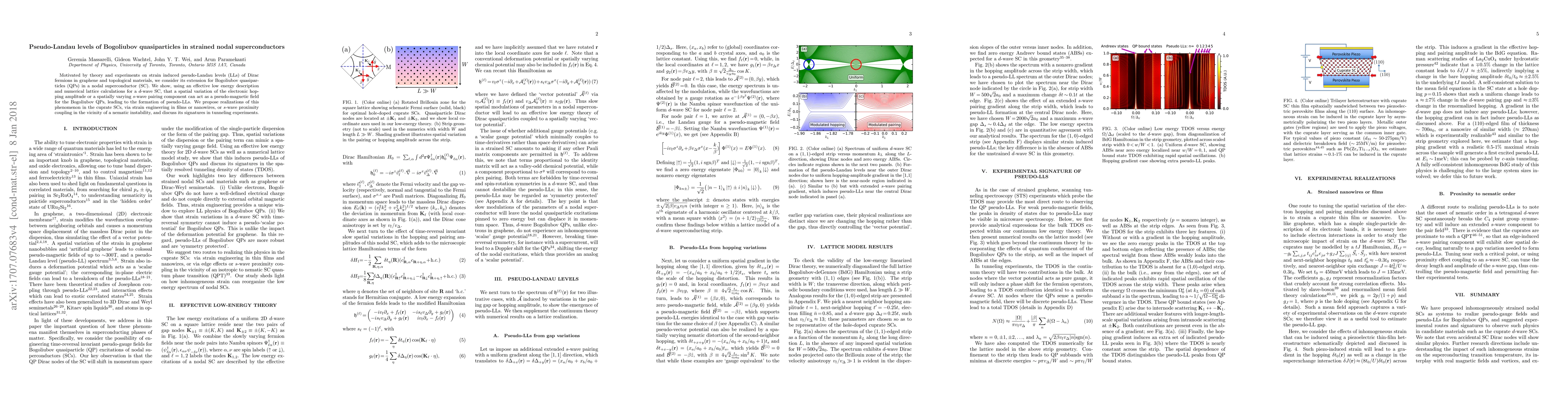 This paper explores the formation of pseudo-Landau levels in Bogoliubov quasiparticles in strained nodal superconductors, demonstrating that spatial variations in electronic hopping or pairing can mimic pseudo-magnetic fields, with potential realizations in cuprate superconductors through strain engineering or proximity coupling. The study proposes signatures of this phenomenon observable in tunneling experiments.