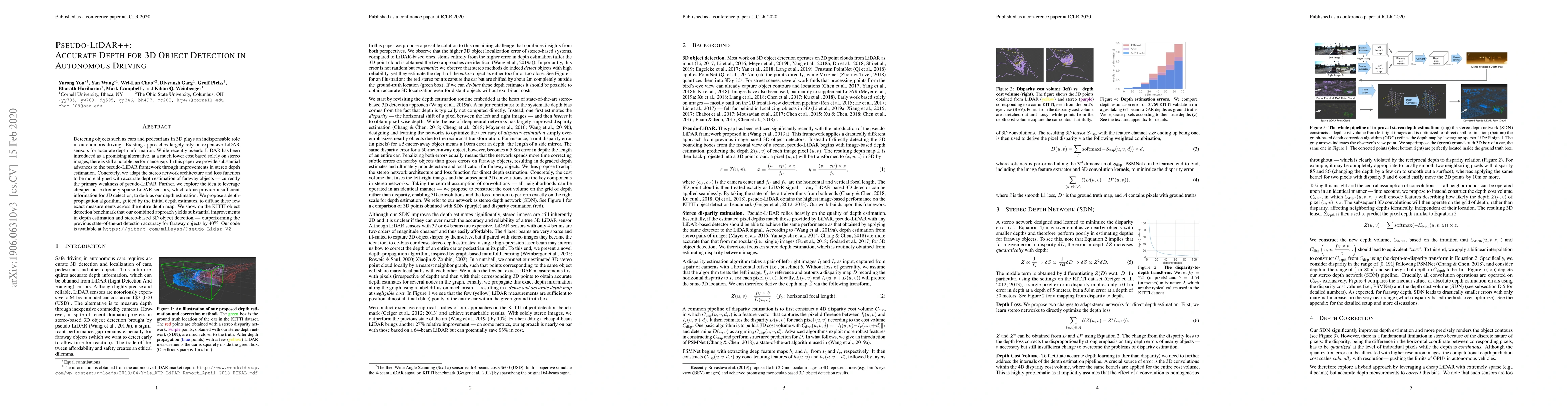 This paper introduces Pseudo-LiDAR++, an advanced framework for accurate 3D object detection using stereo images, addressing the performance gap of existing pseudo-LiDAR methods. It leverages sparse LiDAR data to improve depth estimation and proposes a depth-propagation algorithm to enhance detection accuracy, achieving a 40% improvement in detection of faraway objects on the KITTI benchmark.