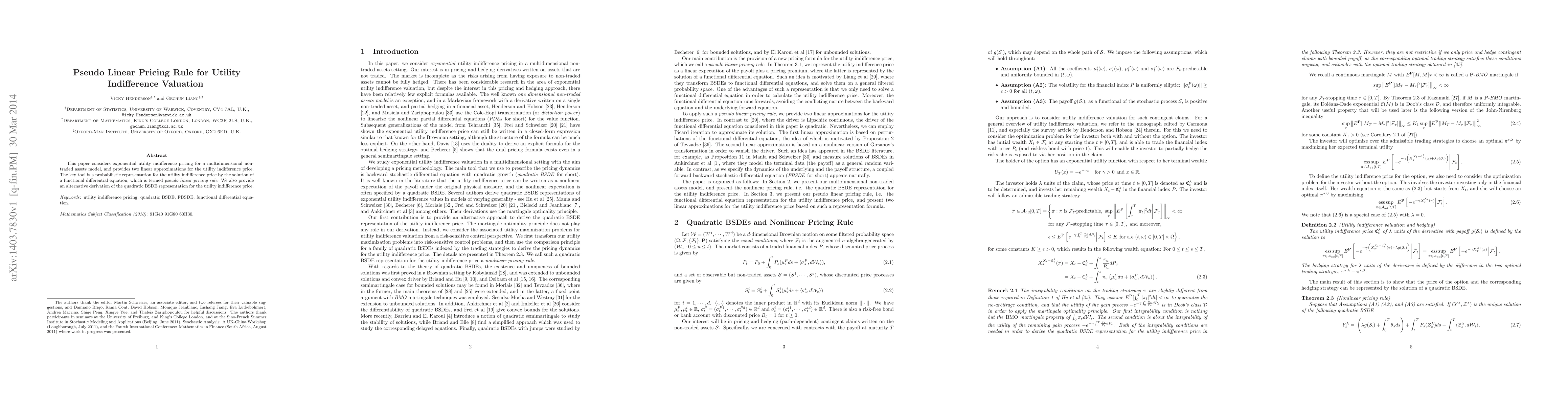 This paper develops a pseudo linear pricing rule for exponential utility indifference pricing in a multidimensional non-traded assets model, offering two linear approximations for the utility indifference price through a probabilistic representation and a functional differential equation. An alternative derivation of the quadratic BSDE representation is also provided.