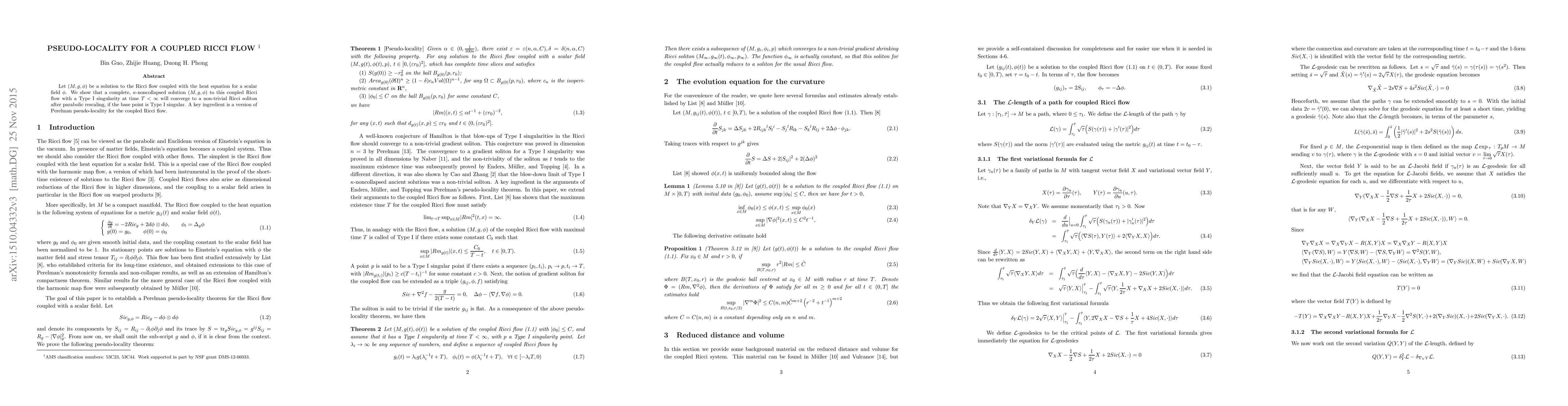Let $(M,g,\phi)$ be a solution to the Ricci flow coupled with the heat equation for a scalar field $\phi$. We show that a complete, $\kappa$-noncollapsed solution $(M,g,\phi)$ to this coupled Ricci flow with a Type I singularity at time $T<\infty$ will converge to a non-trivial Ricci soliton after parabolic rescaling, if the base point is Type I singular. A key ingredient is a version of Perelman pseudo-locality for the coupled Ricci flow.