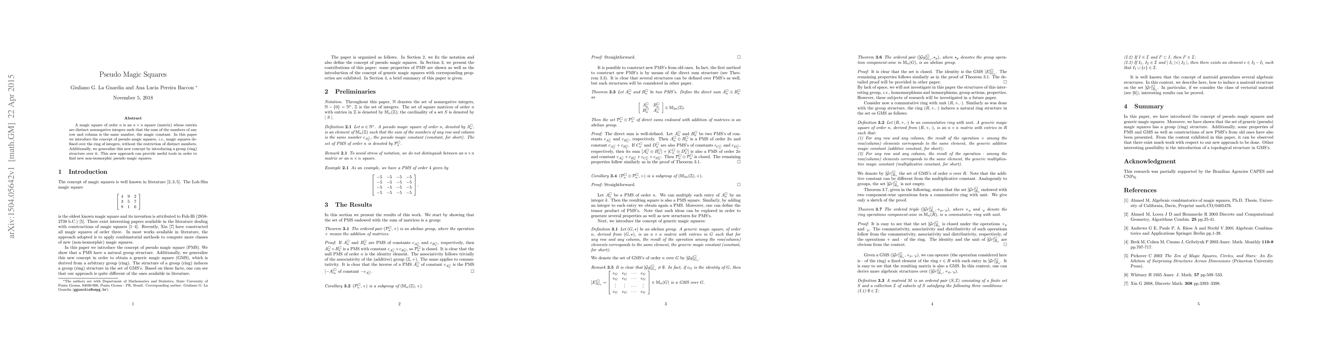 This paper introduces pseudo magic squares, which are n x n matrices with integer entries where the row and column sums are equal, without the restriction of distinct numbers. It further generalizes this concept by establishing a group (ring) structure, offering new tools for finding non-isomorphic pseudo magic squares.