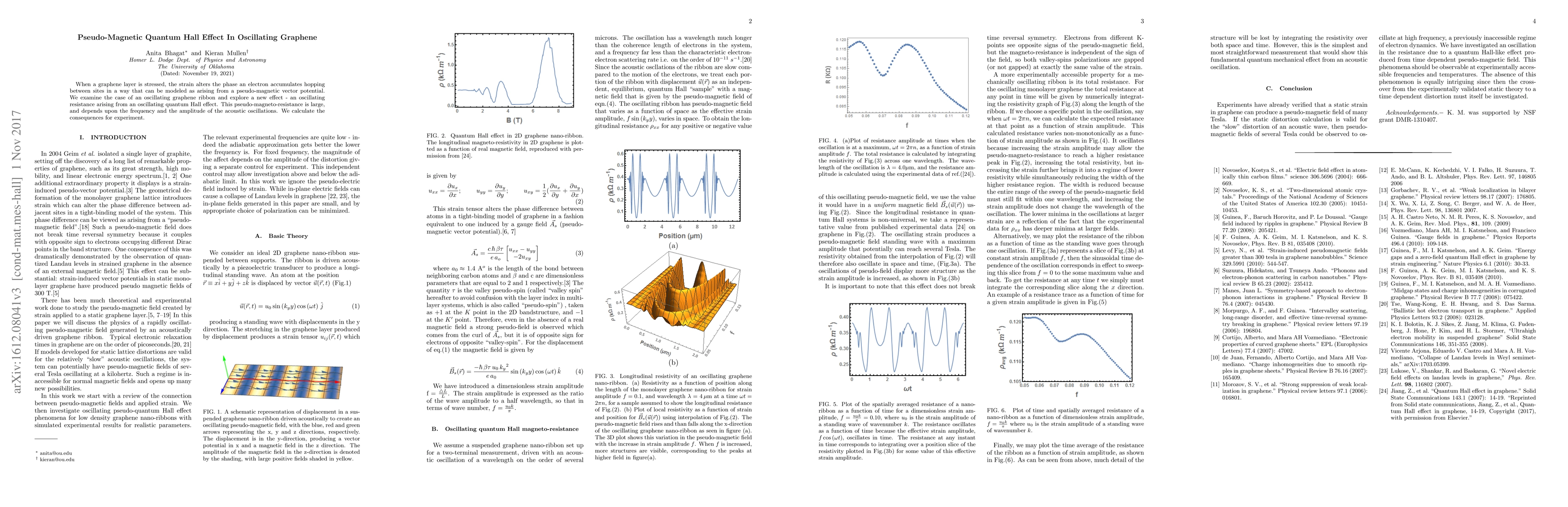 This paper investigates how strain in oscillating graphene induces a pseudo-magnetic quantum Hall effect, leading to an oscillating resistance dependent on the oscillation frequency and amplitude, with significant implications for experimental observations.