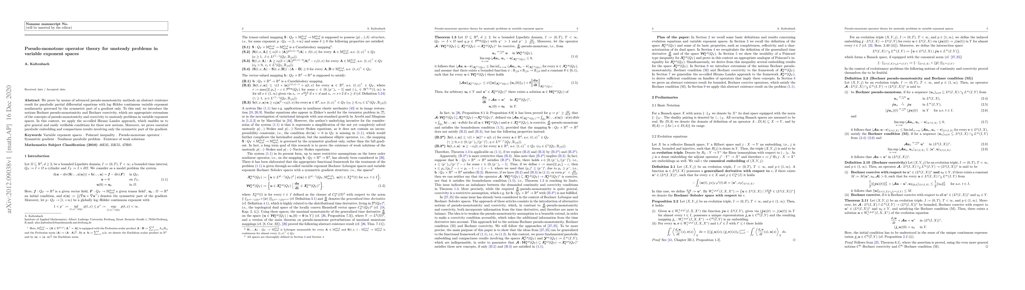 This paper establishes an abstract existence result for parabolic partial differential equations with variable exponent nonlinearity using advanced pseudo-monotonicity methods. It introduces Bochner pseudo-monotonicity and Bochner coercivity for unsteady problems in variable exponent spaces, applying the Hirano-Landes approach to provide general and easily verifiable conditions.