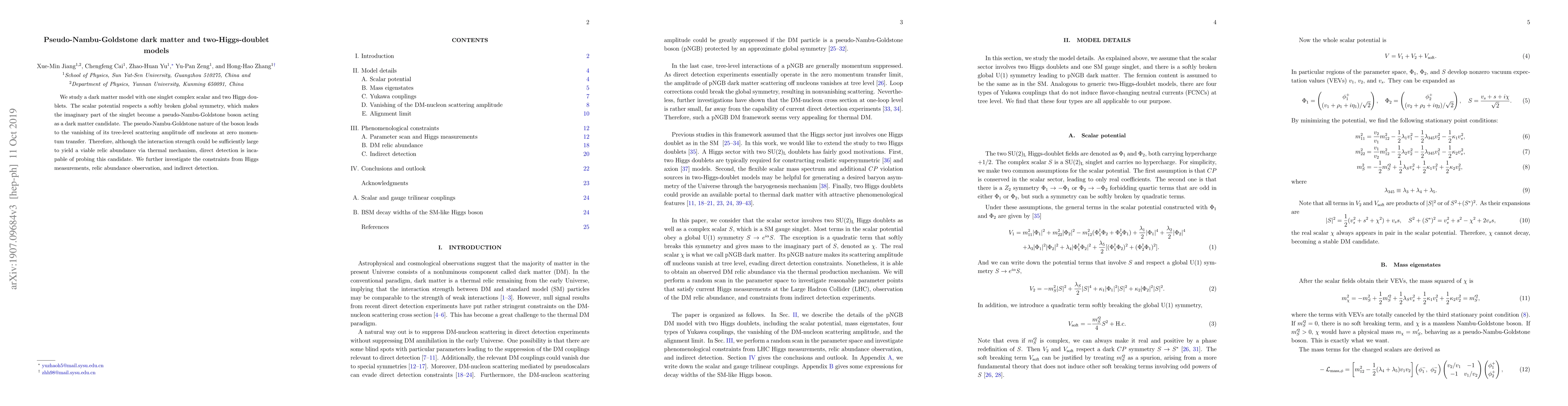 We study a dark matter model with one singlet complex scalar and two Higgs doublets. The scalar potential respects a softly broken global symmetry, which makes the imaginary part of the singlet become a pseudo-Nambu-Goldstone boson acting as a dark matter candidate. The pseudo-Nambu-Goldstone nature of the boson leads to the vanishing of its tree-level scattering amplitude off nucleons at zero momentum transfer. Therefore, although the interaction strength could be sufficiently large to yield a viable relic abundance via thermal mechanism, direct detection is incapable of probing this candidate. We further investigate the constraints from Higgs measurements, relic abundance observation, and indirect detection.