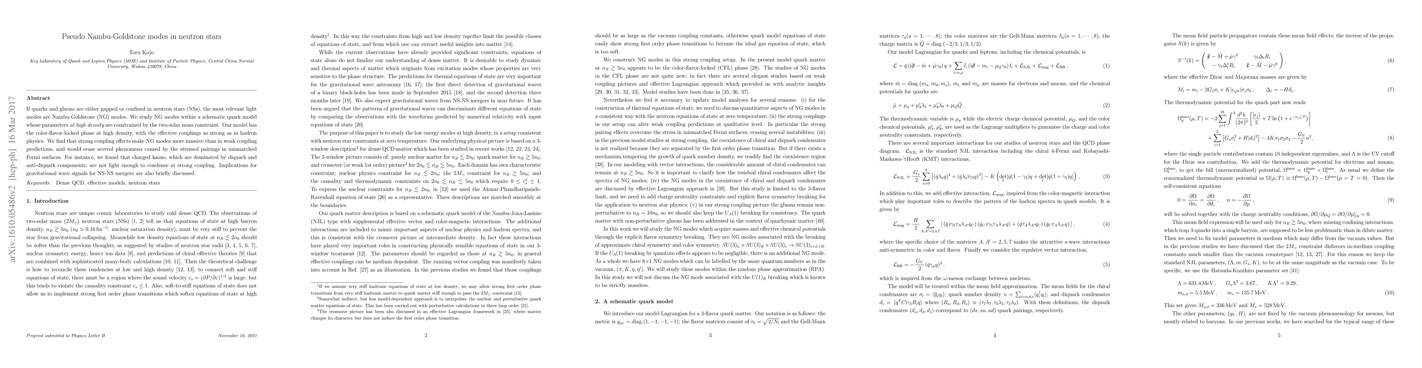 Researchers studied neutron star physics, finding that strong coupling effects make Nambu-Goldstone modes more massive than predicted, potentially erasing certain phenomena and affecting gravitational wave signals.