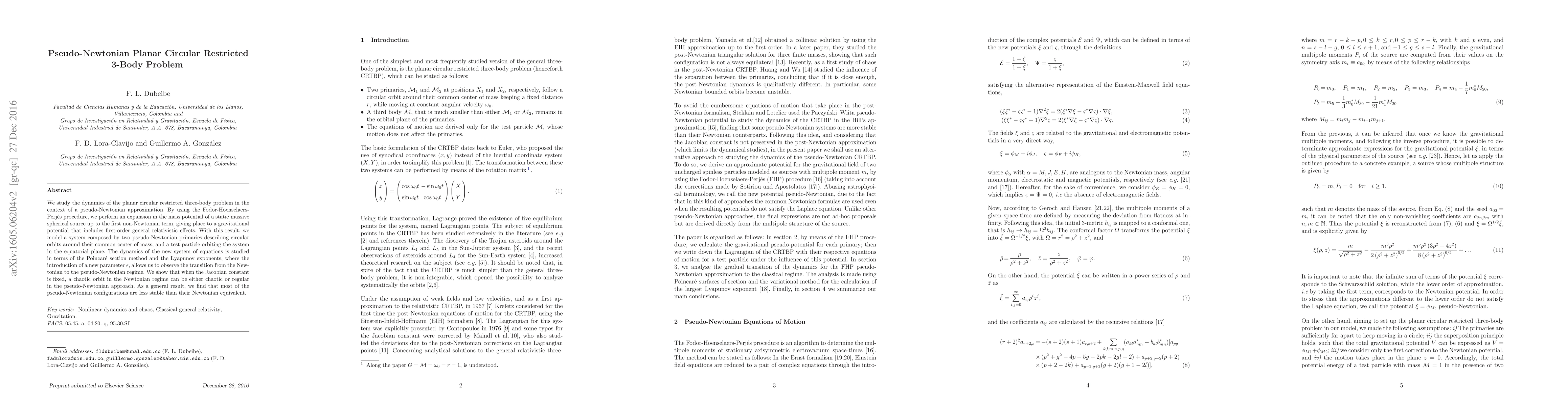 This paper investigates the dynamics of the planar circular restricted three-body problem using a pseudo-Newtonian approximation that incorporates first-order general relativistic effects. The study reveals that pseudo-Newtonian configurations tend to be less stable than their Newtonian counterparts, with chaotic orbits potentially transitioning to regular or chaotic behavior depending on the introduced parameter.
