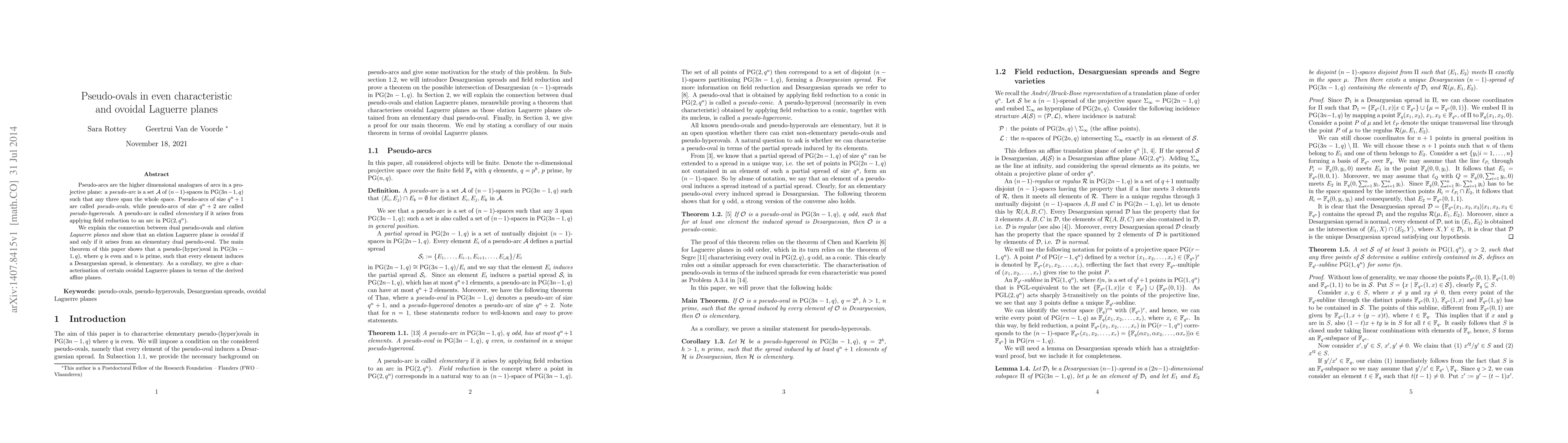 Pseudo-arcs are the higher dimensional analogues of arcs in a projective plane: a pseudo-arc is a set $\mathcal{A}$ of $(n-1)$-spaces in $\mathrm{PG}(3n-1,q)$ such that any three span the whole space. Pseudo-arcs of size $q^n+1$ are called pseudo-ovals, while pseudo-arcs of size $q^n+2$ are called pseudo-hyperovals. A pseudo-arc is called elementary if it arises from applying field reduction to an arc in $\mathrm{PG}(2,q^n)$. We explain the connection between dual pseudo-ovals and elation Laguerre planes and show that an elation Laguerre plane is ovoidal if and only if it arises from an elementary dual pseudo-oval. The main theorem of this paper shows that a pseudo-(hyper)oval in $\mathrm{PG}(3n-1,q)$, where $q$ is even and $n$ is prime, such that every element induces a Desarguesian spread, is elementary. As a corollary, we give a characterisation of certain ovoidal Laguerre planes in terms of the derived affine planes.