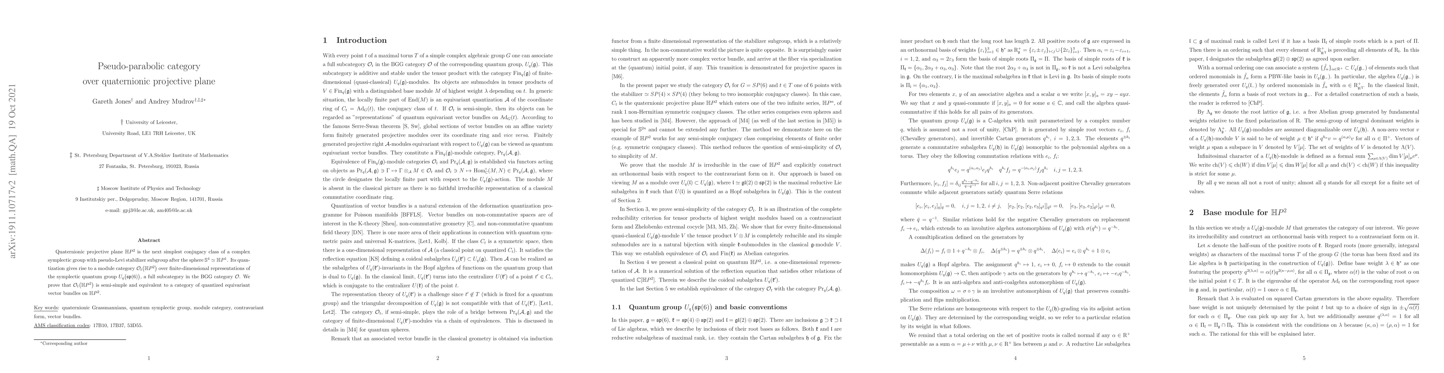 Quaternionic projective plane $\mathbb{H} P^2$ is the next simplest conjugacy class of the symplectic group $SP(6)$ with pseudo-Levi stabilizer subgroup after the sphere $\mathbb{S}^4\simeq \mathbb{H} P^1$. Its quantization gives rise to a module category $\mathcal{O}_t\bigl(\mathbb{H} P^2\bigr)$ over finite-dimensional representations of $U_q\bigl(\mathfrak{s}\mathfrak{p}(6)\bigr)$, a full subcategory in the category $\mathcal{O}$. We prove that $\mathcal{O}_t\bigl(\mathbb{H} P^2\bigr)$ is semi-simple and equaivalent to the category of quantized equivariant vector bundles on $\mathbb{H} P^2$.