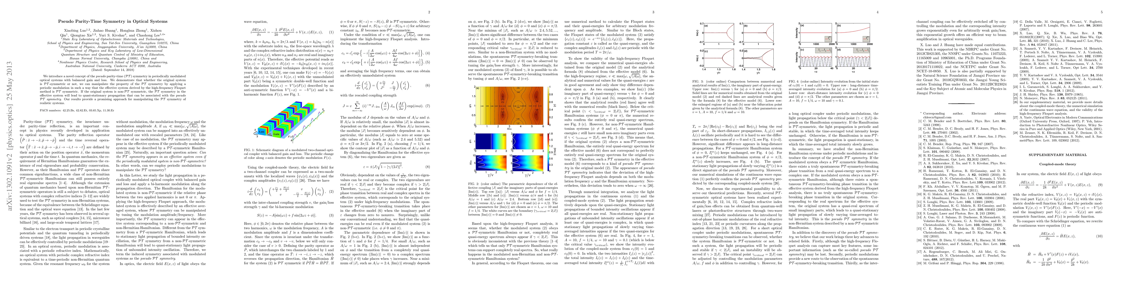 This paper introduces a concept of pseudo parity-time symmetry in optical systems, demonstrating that periodic modulation can create effective $\mathcal{PT}$ symmetry even in non-$\mathcal{PT}$ symmetric systems, leading to quasi-stationary propagation and offering a new method for manipulating $\mathcal{PT}$ symmetry in practical applications.