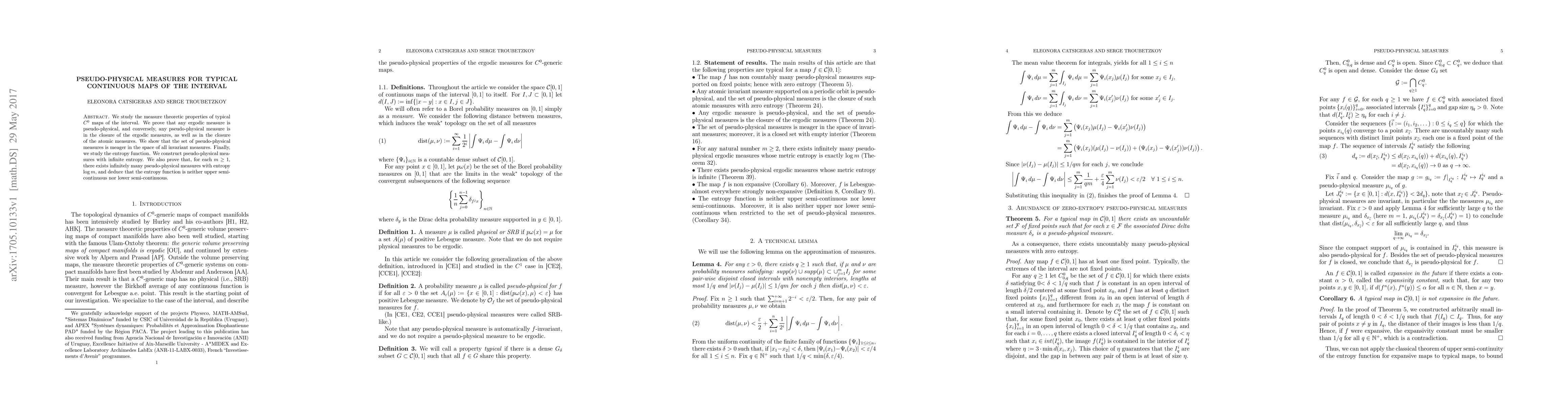 We study the measure theoretic properties of typical C 0 maps of the interval. We prove that any ergodic measure is pseudo-physical, and conversely, any pseudo-physical measure is in the closure of the ergodic measures, as well as in the closure of the atomic measures. We show that the set of pseudo-physical measures is meager in the space of all invariant measures. Finally, we study the entropy function. We construct pseudo-physical measures with infinite entropy. We also prove that, for each m $\ge$ 1, there exists infinitely many pseudo-physical measures with entropy log m, and deduce that the entropy function is neither upper semi-continuous nor lower semi-continuous.