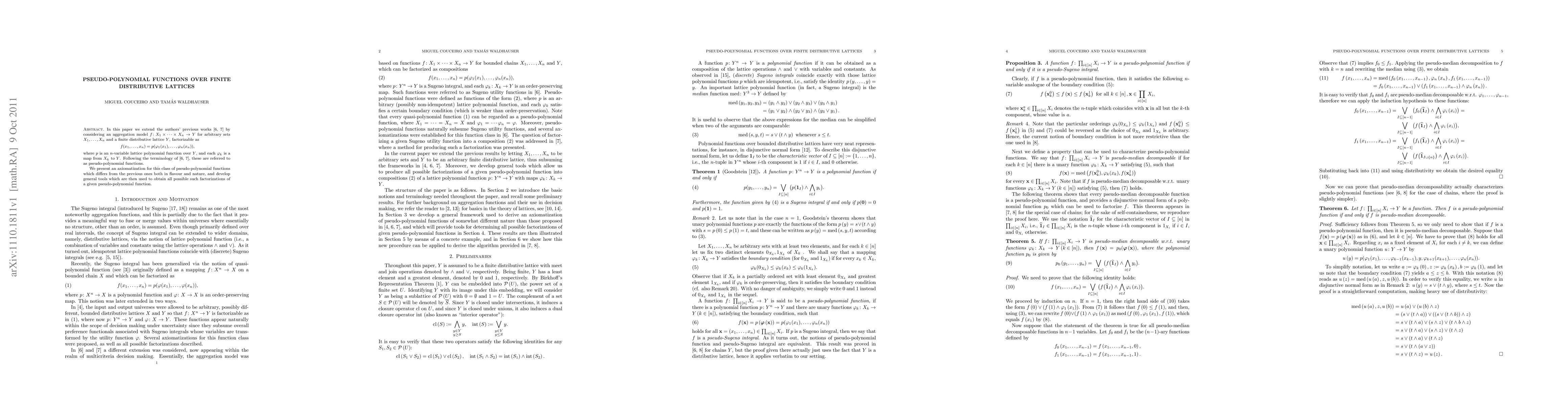 In this paper we consider an aggregation model f: X1 x ... x Xn --> Y for arbitrary sets X1, ..., Xn and a finite distributive lattice Y, factorizable as f(x1, ..., xn) = p(u1(x1), ..., un(xn)), where p is an n-variable lattice polynomial function over Y, and each uk is a map from Xk to Y. The resulting functions are referred to as pseudo-polynomial functions. We present an axiomatization for this class of pseudo-polynomial functions which differs from the previous ones both in flavour and nature, and develop general tools which are then used to obtain all possible such factorizations of a given pseudo-polynomial function.