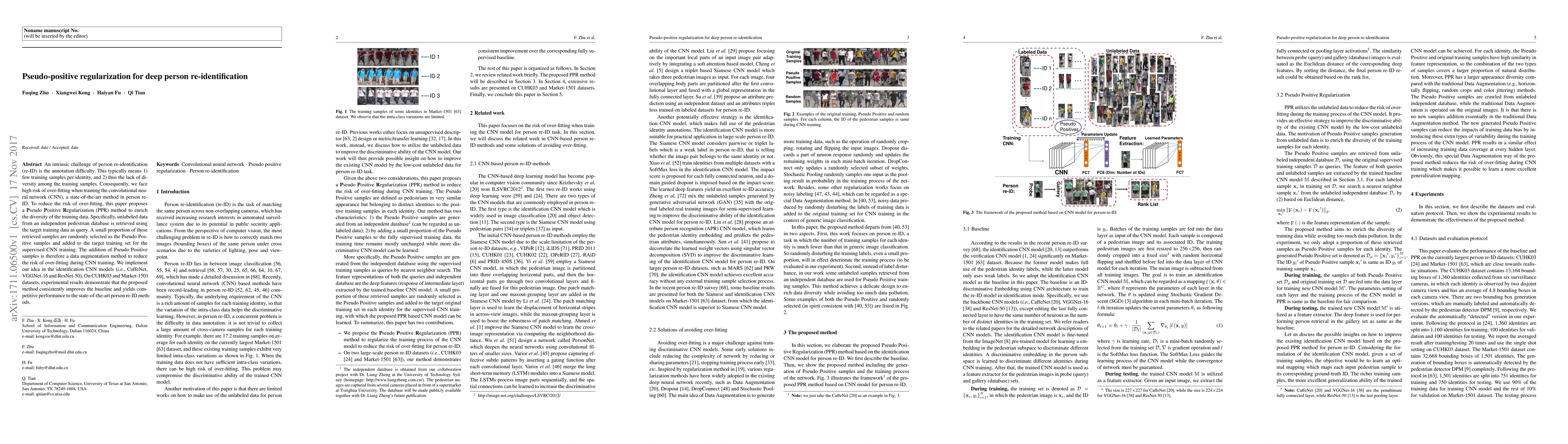 An intrinsic challenge of person re-identification (re-ID) is the annotation difficulty. This typically means 1) few training samples per identity, and 2) thus the lack of diversity among the training samples. Consequently, we face high risk of over-fitting when training the convolutional neural network (CNN), a state-of-the-art method in person re-ID. To reduce the risk of over-fitting, this paper proposes a Pseudo Positive Regularization (PPR) method to enrich the diversity of the training data. Specifically, unlabeled data from an independent pedestrian database is retrieved using the target training data as query. A small proportion of these retrieved samples are randomly selected as the Pseudo Positive samples and added to the target training set for the supervised CNN training. The addition of Pseudo Positive samples is therefore a data augmentation method to reduce the risk of over-fitting during CNN training. We implement our idea in the identification CNN models (i.e., CaffeNet, VGGNet-16 and ResNet-50). On CUHK03 and Market-1501 datasets, experimental results demonstrate that the proposed method consistently improves the baseline and yields competitive performance to the state-of-the-art person re-ID methods.