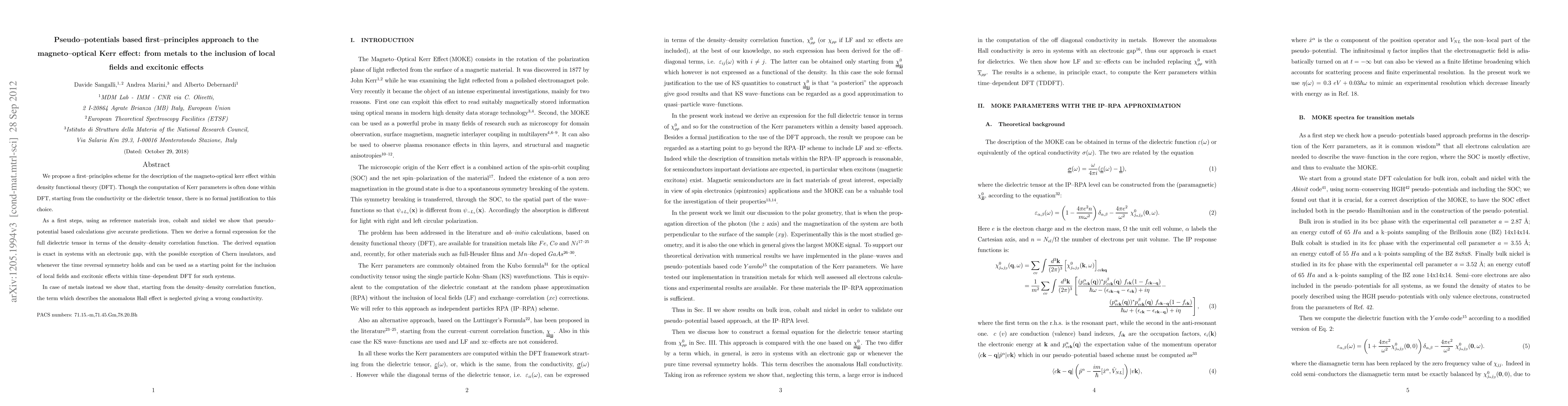 This paper proposes a first-principles method using pseudo-potentials within DFT to accurately describe the magneto-optical Kerr effect, demonstrating its accuracy with transition metals. It introduces a formal expression for the full dielectric tensor, enabling the inclusion of local fields and excitonic effects, while noting the inaccuracy of the method for metals due to neglecting the anomalous Hall effect term.