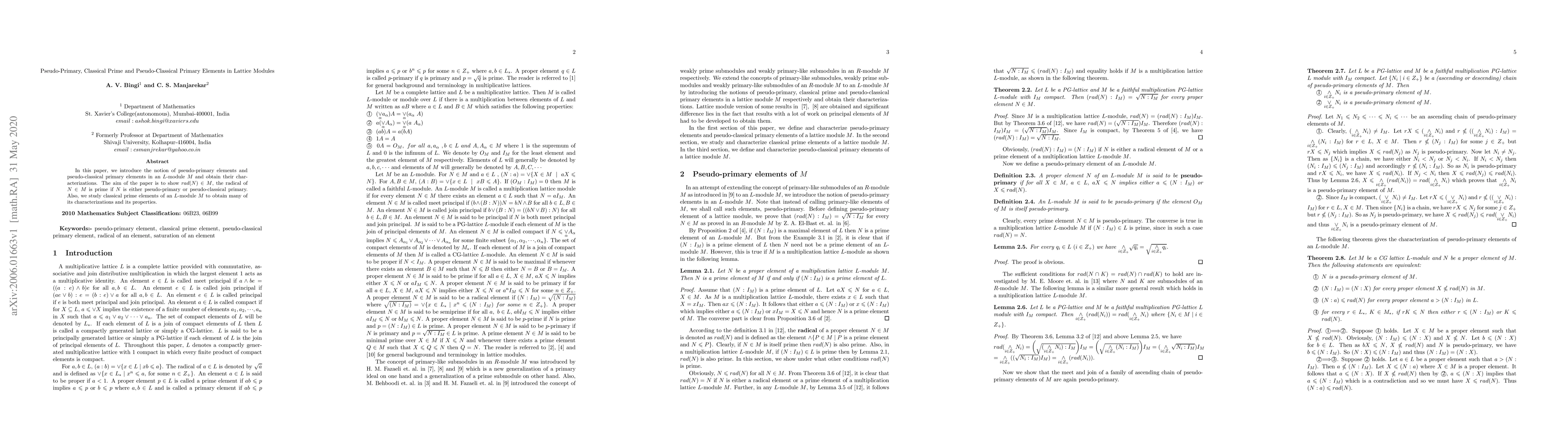 In this paper, we introduce the notion of pseudo-primary elements and pseudo-classical primary elements in an $L$-module $M$ and obtain their characterizations. The aim of the paper is to show $rad(N)\in M$, the radical of $N\in M$ is prime if $N$ is either pseudo-primary or pseudo-classical primary. Also, we study classical prime elements of an $L$-module $M$ to obtain many of its characterizations and its properties.