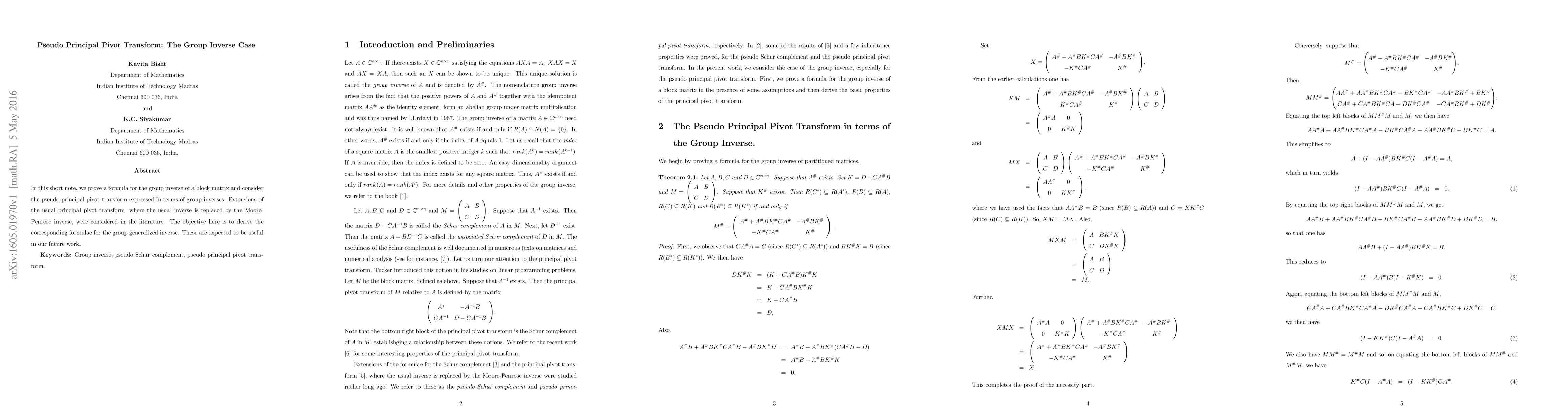 In this short note, we prove a formula for the group inverse of a block matrix and consider the pseudo principal pivot transform expressed in terms of group inverses. Extensions of the usual principal pivot transform, where the usual inverse is replaced by the Moore-Penrose inverse, were considered in the literature. The objective here is to derive the corresponding formulae for the group generalized inverse. These are expected to be useful in our future work.