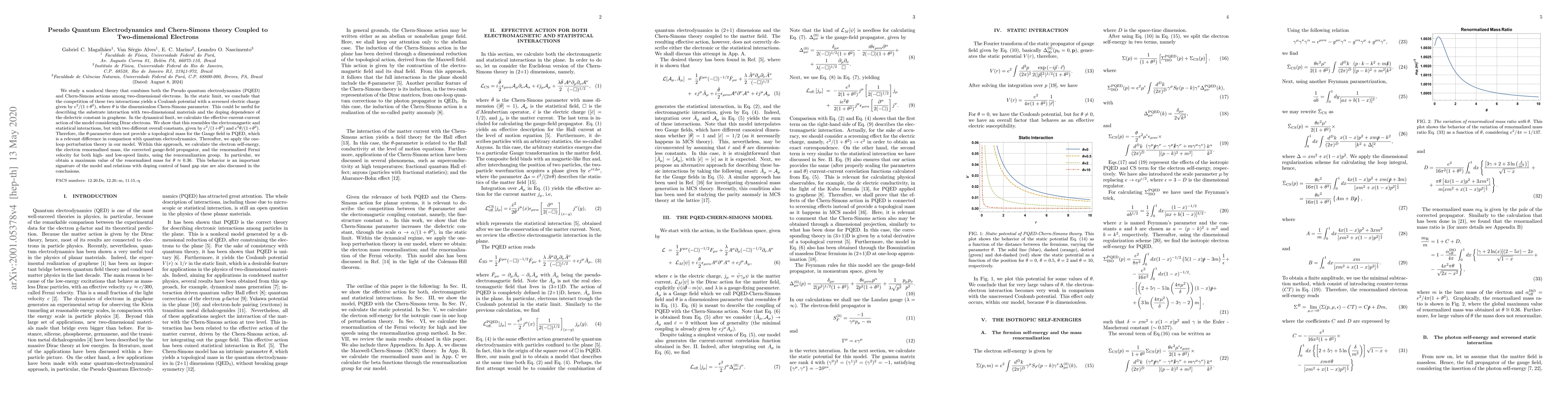 We study a nonlocal theory that combines both the Pseudo quantum electrodynamics (PQED) and Chern-Simons actions among two-dimensional electrons. In the static limit, we conclude that the competition of these two interactions yields a Coulomb potential with a screened electric charge given by $e^2/(1+\theta^2)$, where $\theta$ is the dimensionless Chern-Simons parameter. This could be useful for describing the substrate interaction with two-dimensional materials and the doping dependence of the dielectric constant in graphene. In the dynamical limit, we calculate the effective current-current action of the model considering Dirac electrons. We show that this resembles the electromagnetic and statistical interactions, but with two different overall constants, given by $e^2/(1+\theta^2)$ and $e^2\theta/(1+\theta^2)$. Therefore, the $\theta$-parameter does not provide a topological mass for the Gauge field in PQED, which is a relevant difference in comparison with quantum electrodynamics. Thereafter, we apply the one-loop perturbation theory in our model. Within this approach, we calculate the electron self-energy, the electron renormalized mass, the corrected gauge-field propagator, and the renormalized Fermi velocity for both high- and low-speed limits, using the renormalization group. In particular, we obtain a maximum value of the renormalized mass for $\theta\approx 0.36$. This behavior is an important signature of the model and relations with doping control of band gap size are also discussed in the conclusions.