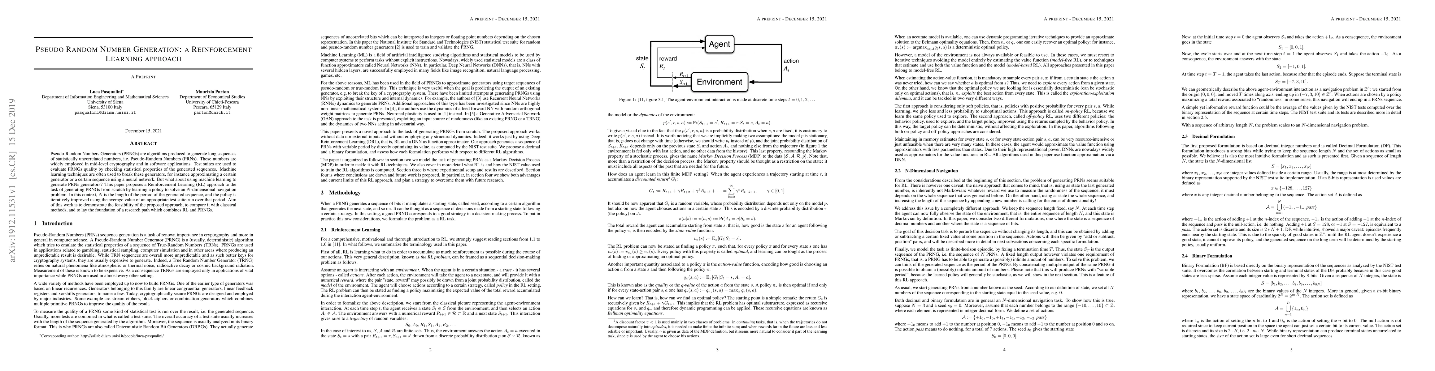 Pseudo-Random Numbers Generators (PRNGs) are algorithms produced to generate long sequences of statistically uncorrelated numbers, i.e. Pseudo-Random Numbers (PRNs). These numbers are widely employed in mid-level cryptography and in software applications. Test suites are used to evaluate PRNGs quality by checking statistical properties of the generated sequences. Machine learning techniques are often used to break these generators, for instance approximating a certain generator or a certain sequence using a neural network. But what about using machine learning to generate PRNs generators? This paper proposes a Reinforcement Learning (RL) approach to the task of generating PRNGs from scratch by learning a policy to solve an N-dimensional navigation problem. In this context, N is the length of the period of the generated sequence, and the policy is iteratively improved using the average value of an appropriate test suite run over that period. Aim of this work is to demonstrate the feasibility of the proposed approach, to compare it with classical methods, and to lay the foundation of a research path which combines RL and PRNGs.