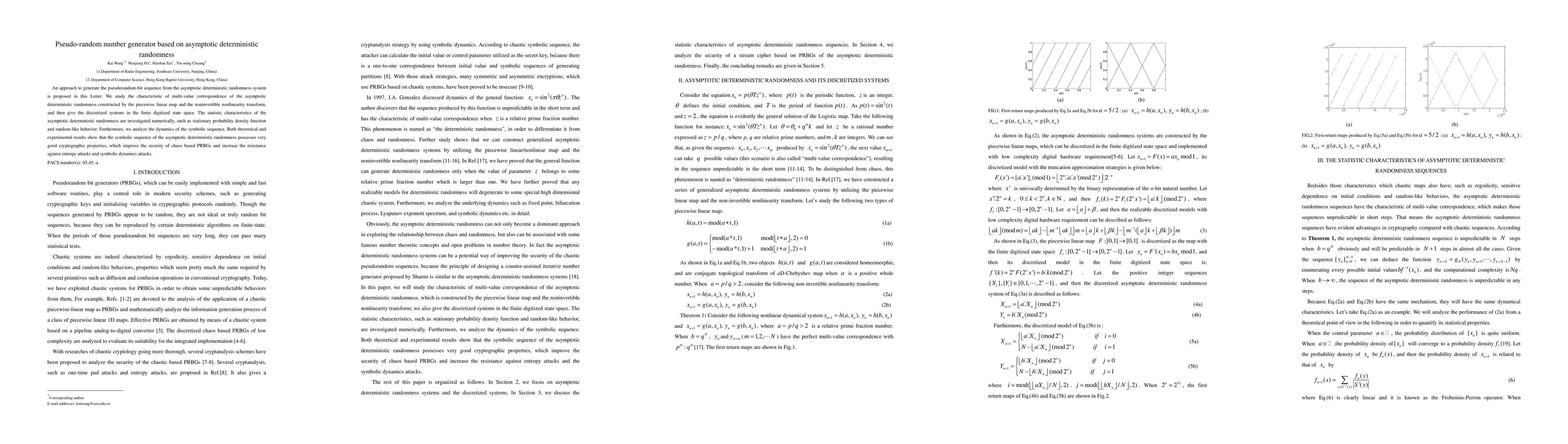 This paper proposes a pseudo-random number generator (PRBG) based on asymptotic deterministic randomness, utilizing a piecewise linear map and nonlinearity transform. The study investigates the statistical characteristics and dynamics of the generated sequence, demonstrating strong cryptographic properties that enhance security against entropy and symbolic dynamics attacks.