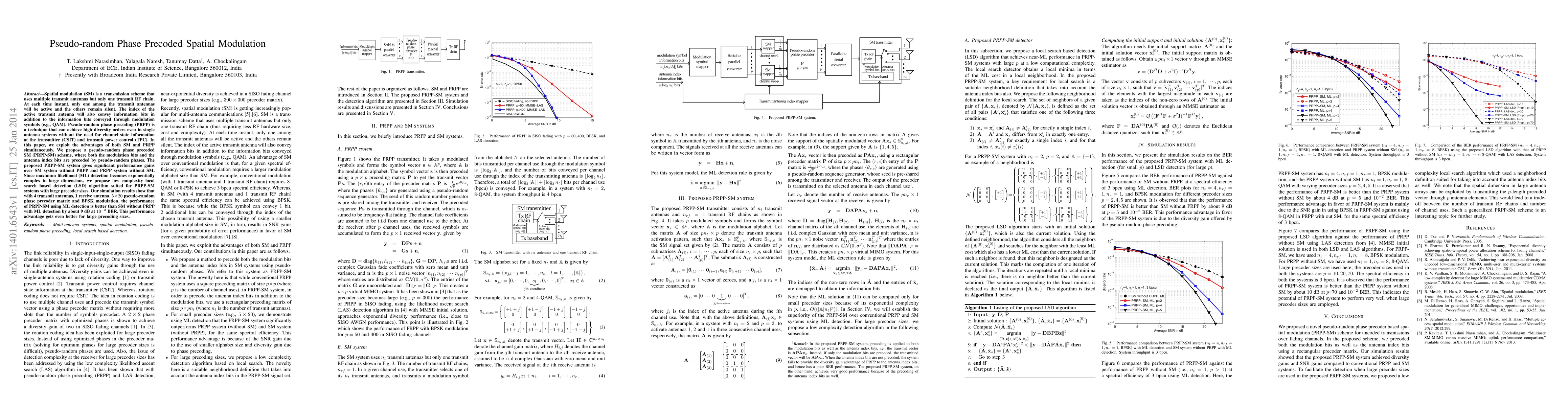Spatial modulation (SM) is a transmission scheme that uses multiple transmit antennas but only one transmit RF chain. At each time instant, only one among the transmit antennas will be active and the others remain silent. The index of the active transmit antenna will also convey information bits in addition to the information bits conveyed through modulation symbols (e.g.,QAM). Pseudo-random phase precoding (PRPP) is a technique that can achieve high diversity orders even in single antenna systems without the need for channel state information at the transmitter (CSIT) and transmit power control (TPC). In this paper, we exploit the advantages of both SM and PRPP simultaneously. We propose a pseudo-random phase precoded SM (PRPP-SM) scheme, where both the modulation bits and the antenna index bits are precoded by pseudo-random phases. The proposed PRPP-SM system gives significant performance gains over SM system without PRPP and PRPP system without SM. Since maximum likelihood (ML) detection becomes exponentially complex in large dimensions, we propose low complexity local search based detection (LSD) algorithm suited for PRPP-SM systems with large precoder sizes. Our simulation results show that with 4 transmit antennas, 1 receive antenna, $5\times 20$ pseudo-random phase precoder matrix and BPSK modulation, the performance of PRPP-SM using ML detection is better than SM without PRPP with ML detection by about 9 dB at $10^{-2}$ BER. This performance advantage gets even better for large precoding sizes.