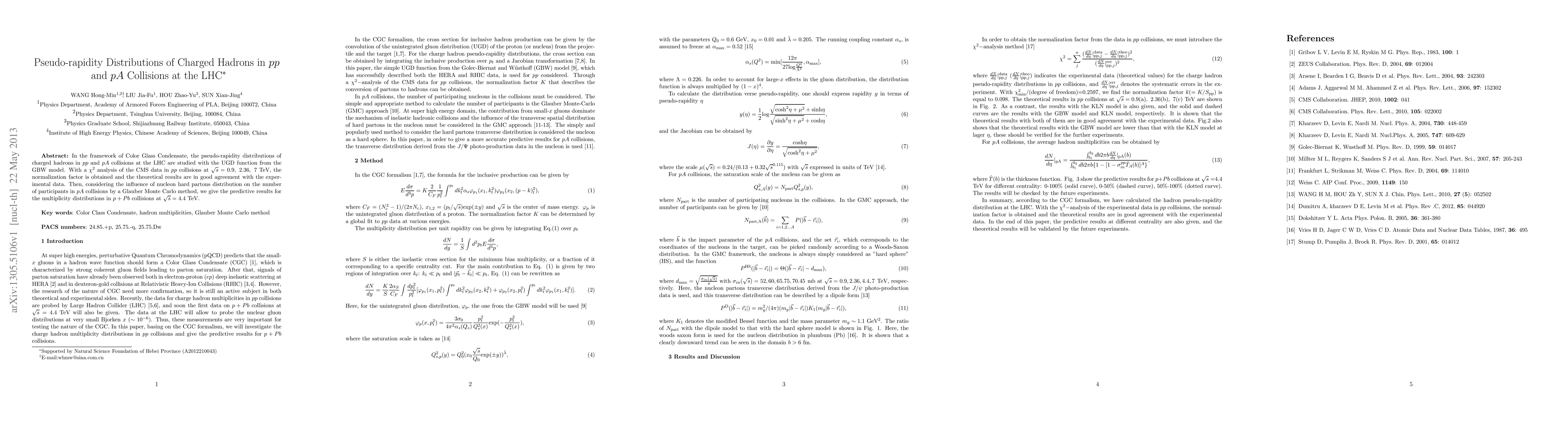 This study investigates pseudo-rapidity distributions of charged hadrons in pp and pA collisions at the LHC using the Color Glass Condensate framework and the UGD function from the GBW model. The analysis confirms good agreement between theoretical results and CMS data for pp collisions at various energies, and predicts multiplicity distributions for p+Pb collisions at $\sqrt{s}=4.4$ TeV.