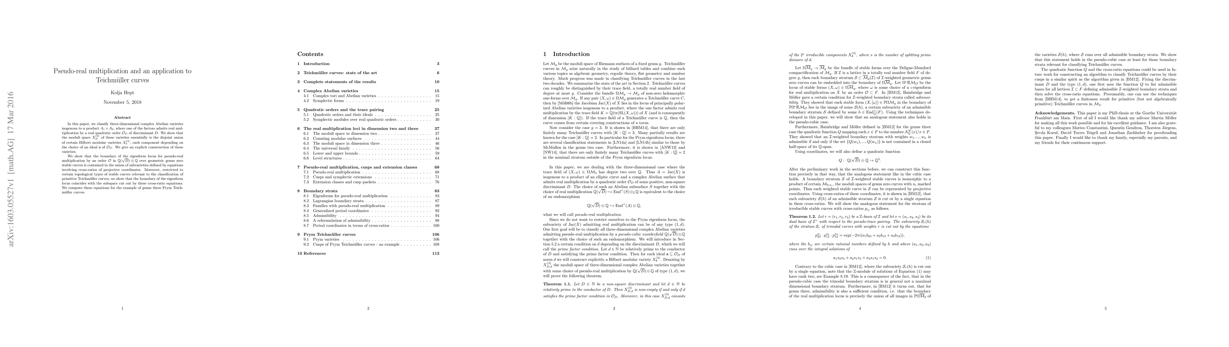 This paper classifies three-dimensional complex Abelian varieties isogenous to a product of two varieties, where one factor has real multiplication by a specific quadratic order. It shows that the moduli space of these varieties is a union of Hilbert modular varieties, constructed explicitly based on ideal choices. Additionally, the paper examines the eigenform locus for pseudo-real multiplication in the context of stable curves, proving its boundary is defined by equations involving cross-ratios, and computes these equations for genus three Prym Teichmüller curves.