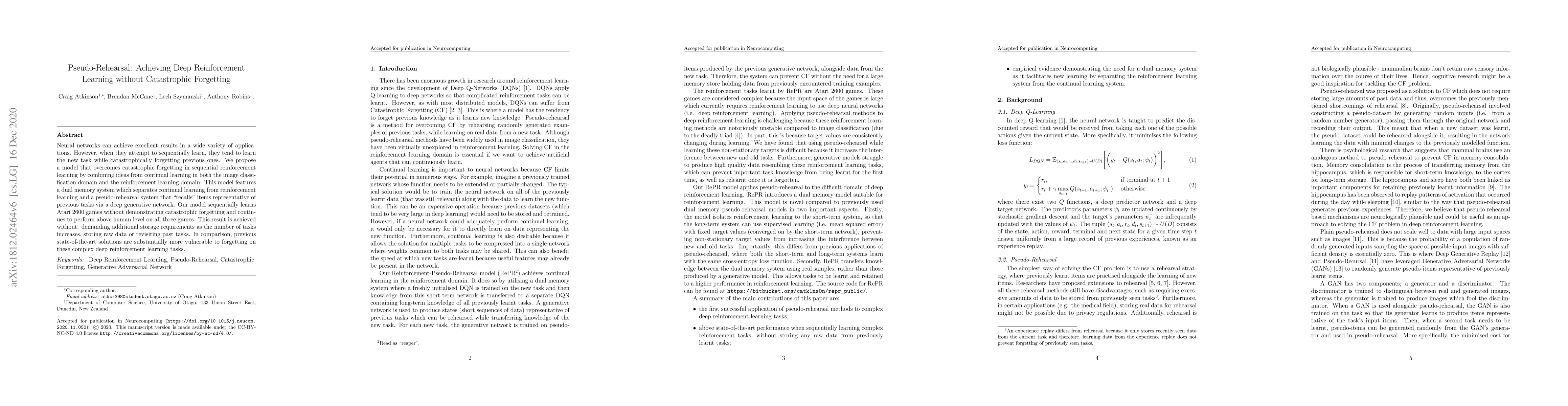 This paper proposes a dual memory system and pseudo-rehearsal method to achieve deep reinforcement learning without catastrophic forgetting. The model effectively learns new tasks sequentially while retaining performance on previous tasks, demonstrating superior performance on Atari 2600 games compared to human levels without additional storage or data revisitation.