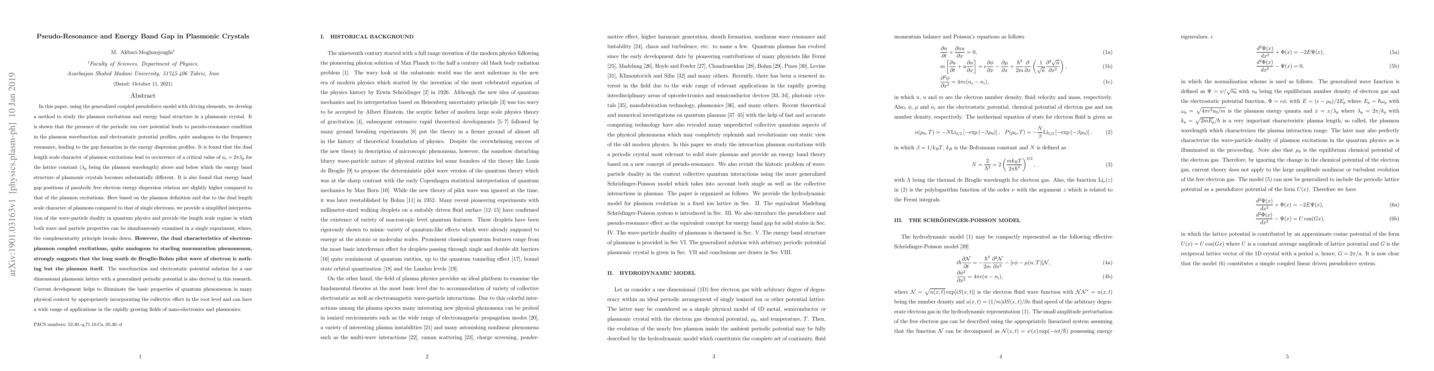In this paper, using the generalized coupled pseudoforce model with driving elements, we develop a method to study the plasmon excitations and energy band structure in a plasmonic crystal. It is shown that the presence of the periodic ion core potential leads to pseudo-resonance condition in the plasmon wavefunction and electrostatic potential profiles, quite analogous to the frequency resonance, leading to the gap formation in the energy dispersion profiles. It is found that the dual length scale character of plasmon excitations lead to occurrence of a critical value of $a_c=2\pi\lambda_p$ for the lattice constant ($\lambda_p$ being the plasmon wavelength) above and below which the energy band structure of plasmonic crystals becomes substantially different. It is also found that energy band gap positions of parabolic free electron energy dispersion relation are slightly higher compared to that of the plasmon excitations. Here based on the plasmon definition and due to the dual length scale character of plasmons compared to that of single electrons, we provide a simplified interpretation of the wave-particle duality in quantum physics and provide the length scale regime in which both wave and particle properties can be simultaneously examined in a single experiment, where, the complementarity principle breaks down. However, the dual characteristics of electron-plasmon coupled excitations, quite analogous to starling murmuration phenomenon, strongly suggests that the long south de Broglie-Bohm pilot wave of electron is nothing but the plasmon itself. The wavefunction and electrostatic potential solution for a one dimensional plasmonic lattice with a generalized periodic potential is also derived in this research.