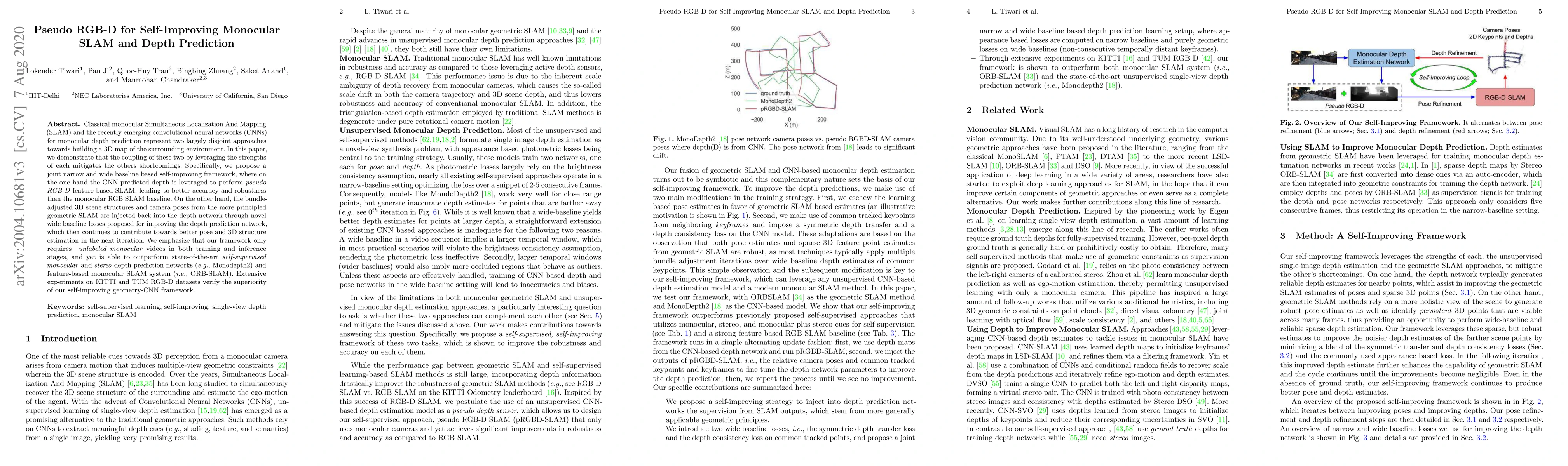 This paper proposes a self-improving framework combining monocular SLAM and CNN-based depth prediction, leveraging pseudo RGB-D features to enhance both depth accuracy and SLAM robustness. The framework iteratively refines depth predictions and SLAM performance using unlabeled monocular videos, outperforming state-of-the-art methods on KITTI and TUM RGB-D datasets.