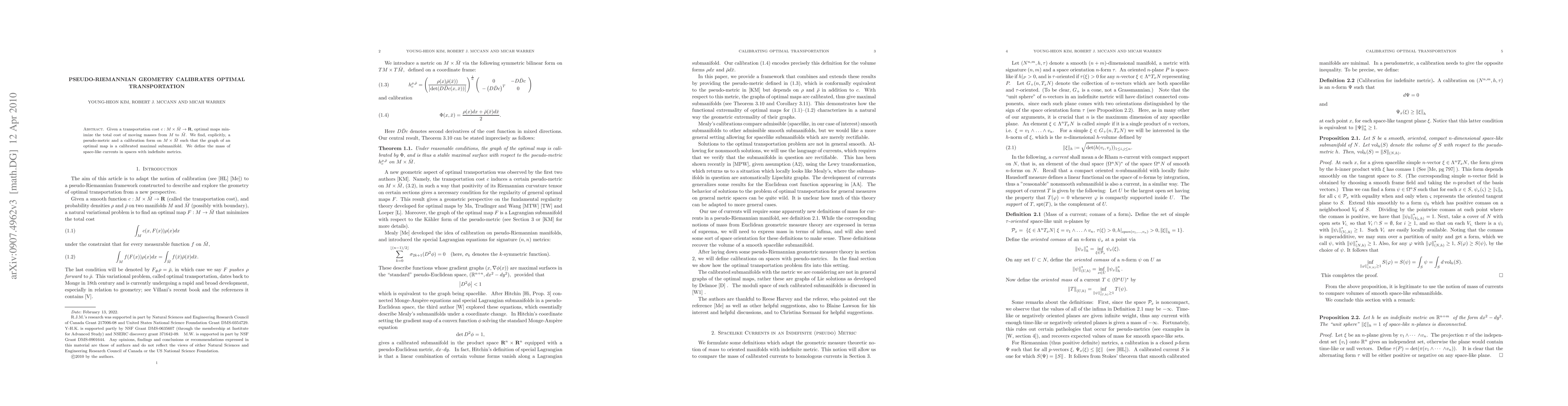 Given a transportation cost $c: M \times\bar M \to\mathbf{R}$, optimal maps minimize the total cost of moving masses from $M$ to $\bar M$. We find a pseudo-metric and a calibration form on $M\times\bar M$ such that the graph of an optimal map is a calibrated maximal submanifold. We define the mass of space-like currents in spaces with indefinite metrics.