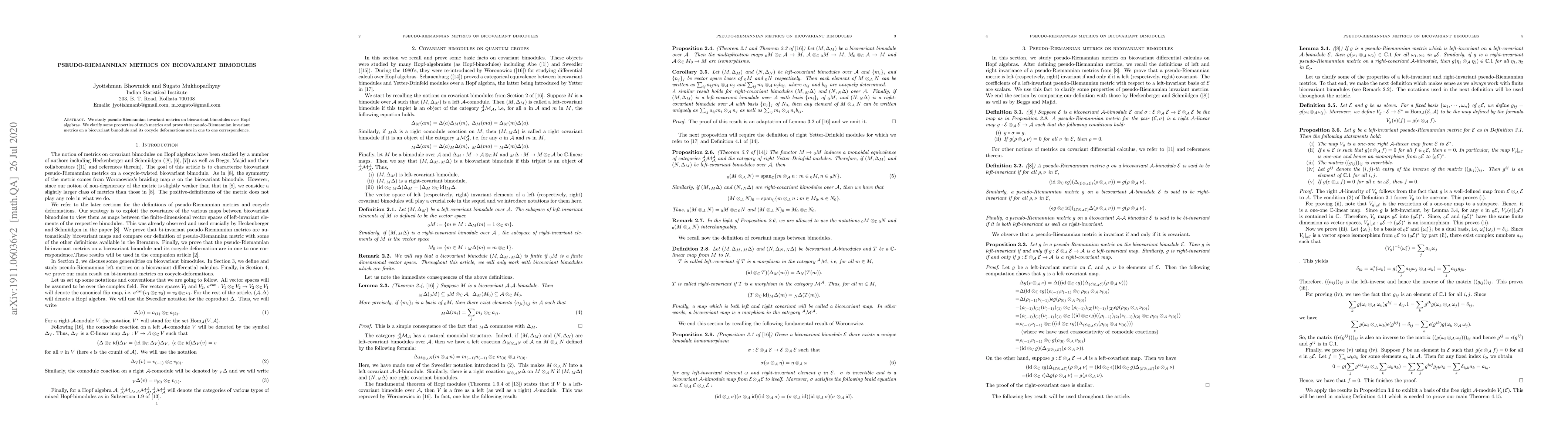 We study pseudo-Riemannian invariant metrics on bicovariant bimodules over Hopf algebras. We clarify some properties of such metrics and prove that pseudo-Riemannian invariant metrics on a bicovariant bimodule and its cocycle deformations are in one to one correspondence.