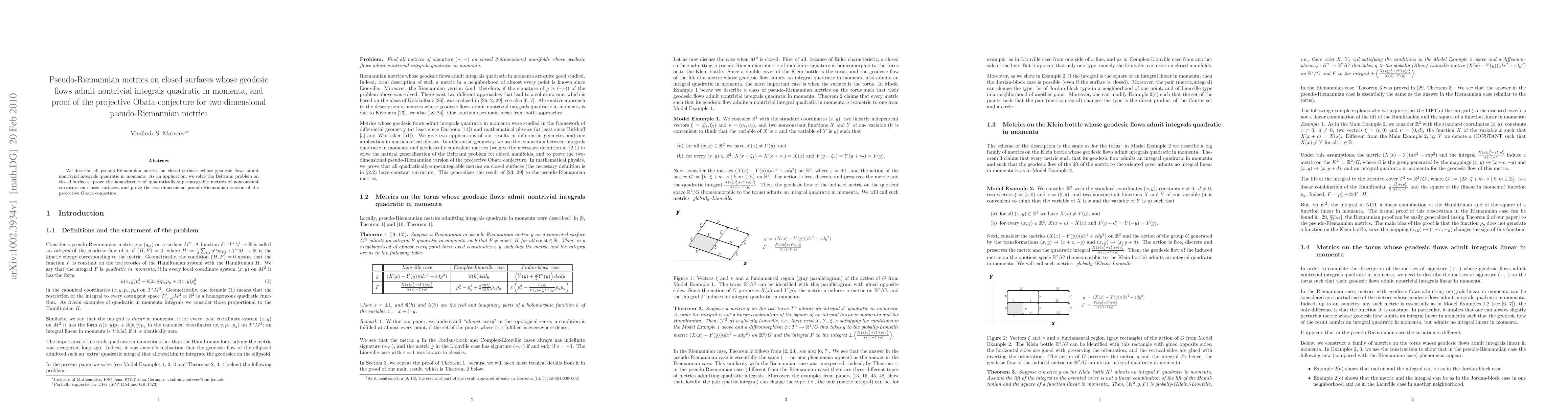 This paper identifies pseudo-Riemannian metrics on closed surfaces with geodesic flows admitting nontrivial quadratic integrals in momenta, and proves the two-dimensional projective Obata conjecture for such metrics. It also addresses the Beltrami problem and demonstrates the nonexistence of superintegrable metrics with nonconstant curvature on closed surfaces.