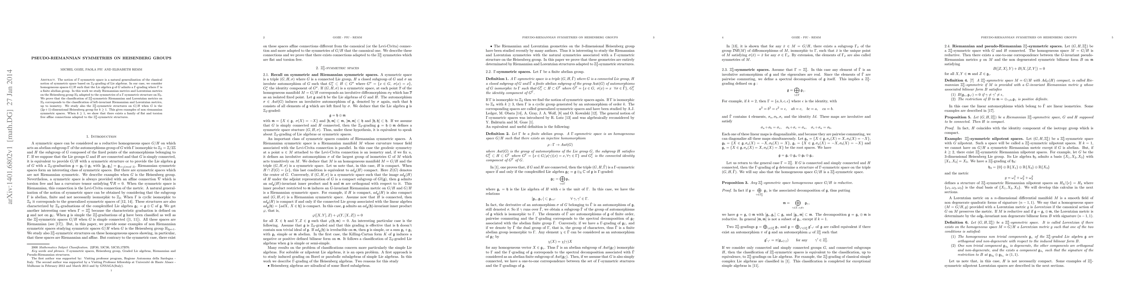 The notion of $\Gamma$-symmetric space is a natural generalization of the classical notion of symmetric space based on $\Z_2$-grading of Lie algebras. In our case, we consider homogeneous spaces $G/H$ such that the Lie algebra $\g$ of $G$ admits a $\Gamma$-grading where $\Gamma$ is a finite abelian group. In this work we study Riemannian metrics and Lorentzian metrics on the Heisenberg group $\mathbb{H}_3$ adapted to the symmetries of a $\Gamma$-symmetric structure on $\mathbb{H}_3$. We prove that the classification of $\z$-symmetric Riemannian and Lorentzian metrics on $\mathbb{H}_3$ corresponds to the classification of left-invariant Riemannian and Lorentzian metrics, up to isometry. We study also the $\Z_2^k$-symmetric structures on $G/H$ when $G$ is the $(2p+1)$-dimensional Heisenberg group for $k \geq 1$. This gives examples of non riemannian symmetric spaces. When $k \geq 1$, we show that there exists a family of flat and torsion free affine connections adapted to the $\Z_2^k$-symmetric structures.