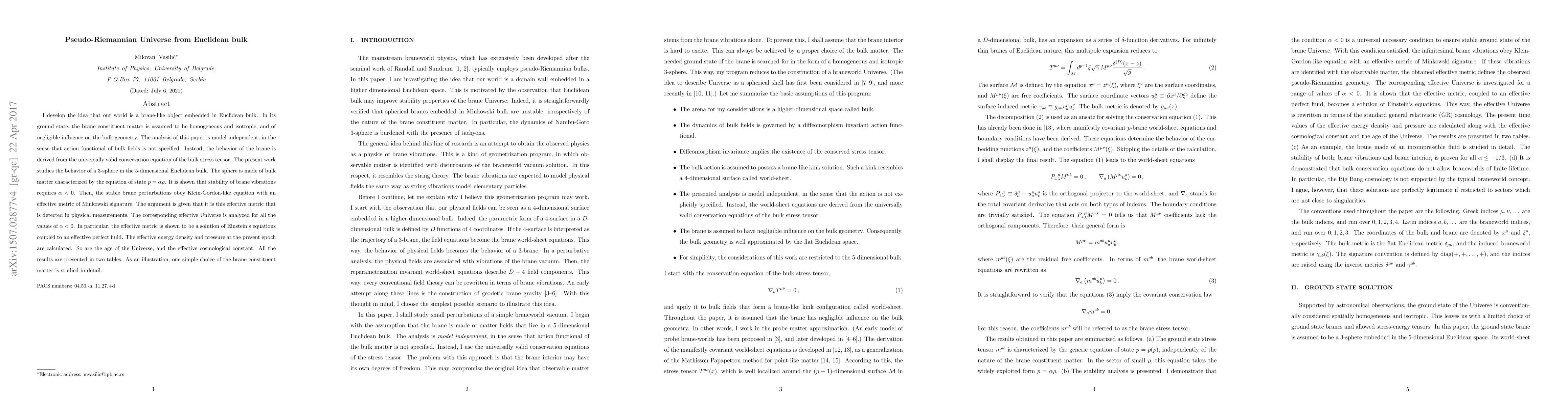 I develop the idea that our world is a brane-like object embedded in Euclidean bulk. In its ground state, the brane constituent matter is assumed to be homogeneous and isotropic, and of negligible influence on the bulk geometry. The analysis of this paper is model independent, in the sense that action functional of bulk fields is not specified. Instead, the behavior of the brane is derived from the universally valid conservation equation of the bulk stress tensor. The present work studies the behavior of a $3$-sphere in the $5$-dimensional Euclidean bulk. The sphere is made of bulk matter characterized by the equation of state $p=\alpha\rho$. It is shown that stability of brane vibrations requires $\alpha < 0$. Then, the stable brane perturbations obey Klein-Gordon-like equation with an effective metric of Minkowski signature. The argument is given that it is this effective metric that is detected in physical measurements. The corresponding effective Universe is analyzed for all the values of $\alpha<0$. In particular, the effective metric is shown to be a solution of Einstein's equations coupled to an effective perfect fluid. The effective energy density and pressure at the present epoch are calculated. So are the age of the Universe, and the effective cosmological constant. All the results are presented in two tables. As an illustration, one simple choice of the brane constituent matter is studied in detail.