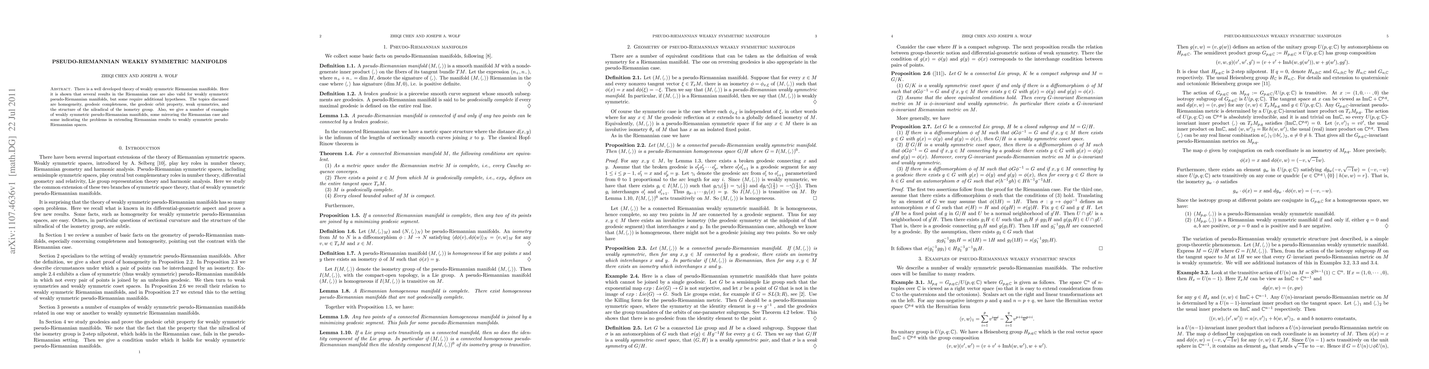 This paper extends the theory of weakly symmetric Riemannian manifolds to pseudo-Riemannian manifolds, showing that while many results hold, additional hypotheses are sometimes necessary. It examines homogeneity, geodesic completeness, and the structure of the isometry group's nilradical, alongside providing examples that illustrate both parallels and divergences from the Riemannian case.