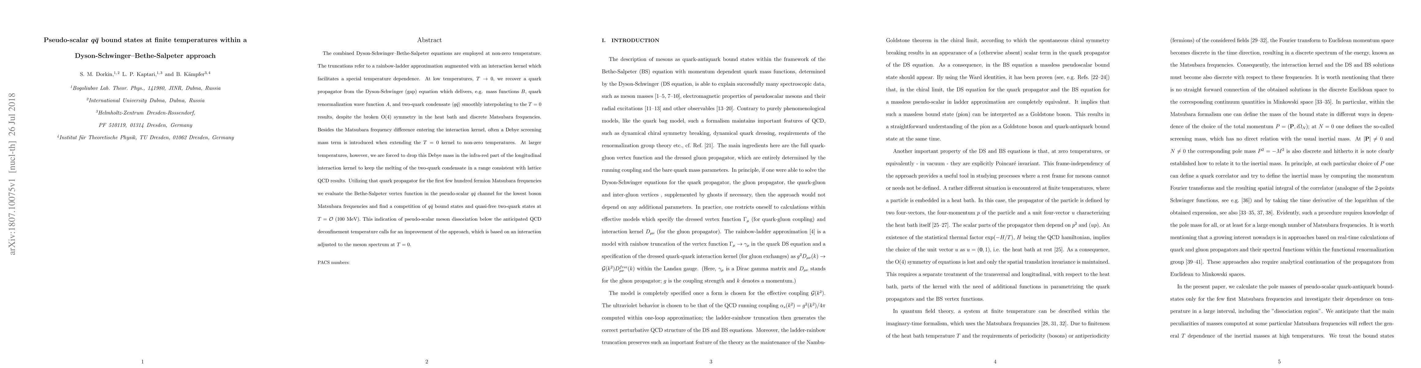 The combined Dyson-Schwinger--Bethe-Salpeter equations are employed at non-zero temperature. The truncations refer to a rainbow-ladder approximation augmented with an interaction kernel which facilitates a special temperature dependence. At low temperatures, $T \to 0$, we recover a quark propagator from the Dyson-Schwinger (gap) equation which delivers, e.g. mass functions $B$, quark renormalization wave function $A$, and two-quark condensate $\la q \bar q \ra$ smoothly interpolating to the $T = 0$ results, despite the broken O(4) symmetry in the heat bath and discrete Matsubara frequencies. Besides the Matsubara frequency difference entering the interaction kernel, often a Debye screening mass term is introduced when extending the $T = 0$ kernel to non-zero temperatures. At larger temperatures, however, we are forced to drop this Debye mass in the infra-red part of the longitudinal interaction kernel to keep the melting of the two-quark condensate in a range consistent with lattice QCD results. Utilizing that quark propagator for the first few hundred fermion Matsubara frequencies we evaluate the Bethe-Salpeter vertex function in the pseudo-scalar $ q \bar q$ channel for the lowest boson Matsubara frequencies and find a competition of $ q \bar q$ bound states and quasi-free two-quark states at $T = {\cal O}$ (100 MeV). This indication of pseudo-scalar meson dissociation below the anticipated QCD deconfinement temperature calls for an improvement of the approach, which is based on an interaction adjusted to the meson spectrum at $T = 0$.