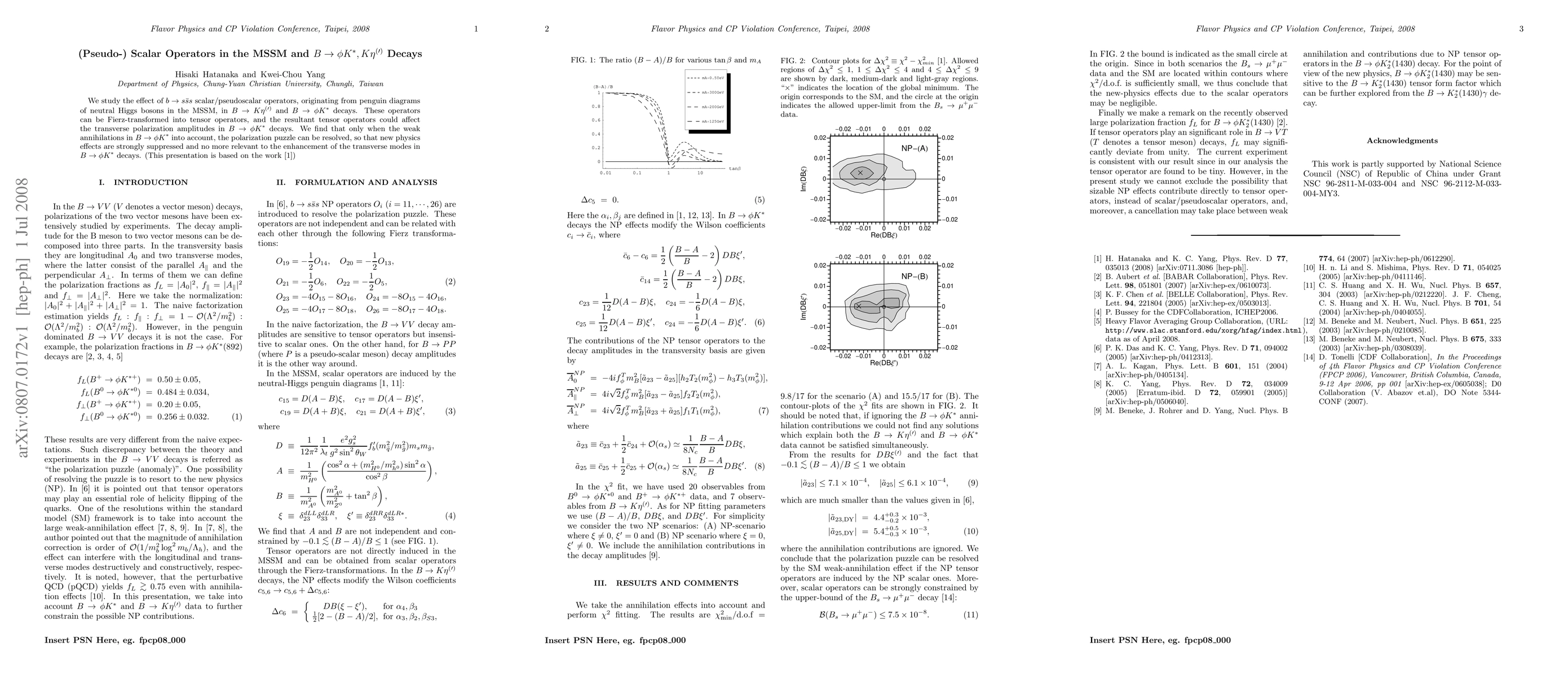 We study the effect of b to s sbar s scalar/pseudoscalar operators, originating from penguin diagrams of neutral Higgs bosons in the MSSM, in B to K eta(') and B to phi K^* decays. These operators can be Fierz-transformed into tensor operators, and the resultant tensor operators could affect the transverse polarization amplitudes in B to phi K^* decays. We find that only when the weak annihilations in B to phi K^* into account, the polarization puzzle can be resolved, so that new physics effects are strongly suppressed and no more relevant to the enhancement of the transverse modes in B to phi K^* decays.