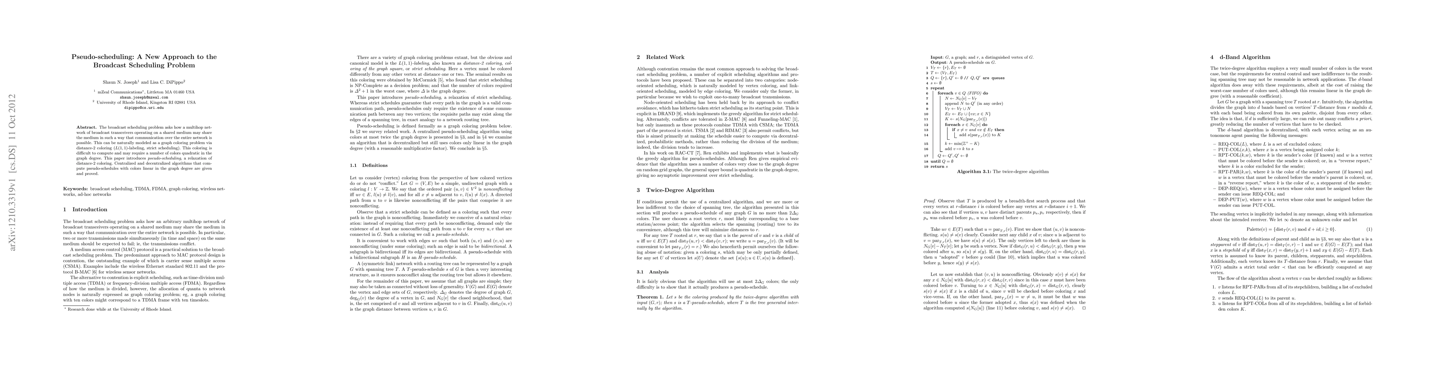 The broadcast scheduling problem asks how a multihop network of broadcast transceivers operating on a shared medium may share the medium in such a way that communication over the entire network is possible. This can be naturally modeled as a graph coloring problem via distance-2 coloring (L(1,1)-labeling, strict scheduling). This coloring is difficult to compute and may require a number of colors quadratic in the graph degree. This paper introduces pseudo-scheduling, a relaxation of distance-2 coloring. Centralized and decentralized algorithms that compute pseudo-schedules with colors linear in the graph degree are given and proved.
