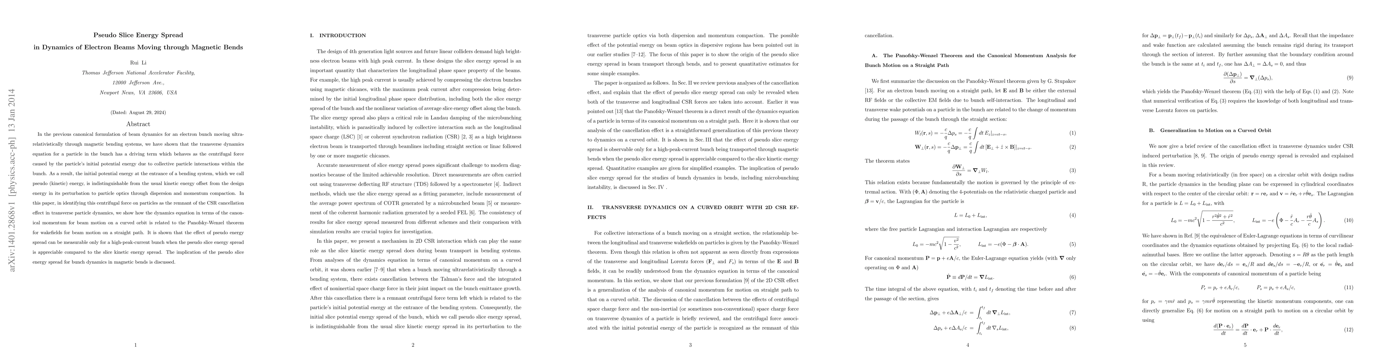 In the previous canonical formulation of beam dynamics for an electron bunch moving ultrarelativistically through magnetic bending systems, we have shown that the transverse dynamics equation for a particle in the bunch has a driving term which behaves as the centrifugal force caused by the particle's initial potential energy due to collective particle interactions within the bunch. As a result, the initial potential energy at the entrance of a bending system, which we call pseudo (kinetic) energy, is indistinguishable from the usual kinetic energy offset from the design energy in its perturbation to particle optics through dispersion and momentum compaction. In this paper, in identifying this centrifugal force on particles as the remnant of the CSR cancellation effect in transverse particle dynamics, we show how the dynamics equation in terms of the canonical momentum for beam motion on a curved orbit is related to the Panofsky-Wenzel theorem for wakefields for beam motion on a straight path. It is shown that the effect of pseudo energy spread can be measurable only for a high-peak-current bunch when the pseudo slice energy spread is appreciable compared to the slice kinetic energy spread. The implication of the pseudo slice energy spread for bunch dynamics in magnetic bends is discussed.