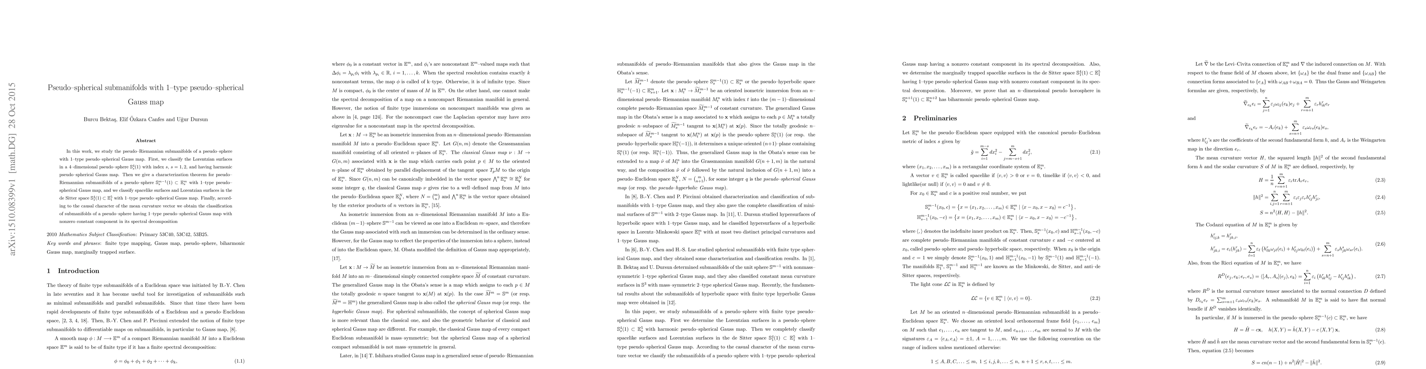 In this work, we study the pseudo-Riemannian submanifolds of a pseudo-sphere with 1-type pseudo-spherical Gauss map. First, we classify the Lorentzian surfaces in a 4-dimensional pseudo-sphere $\mathbb{S}^4_s(1)$ with index s, $s=1, 2$, and having harmonic pseudo-spherical Gauss map. Then we give a characterization theorem for pseudo-Riemannian submanifolds of a pseudo-sphere $\mathbb{S}^{m-1}_s(1)\subset\mathbb{E}^m_s$ with 1-type pseudo-spherical Gauss map, and we classify spacelike surfaces and Lorentzian surfaces in the de Sitter space $\mathbb{S}^4_1(1)\subset\mathbb{E}^5_1$ with 1-type pseudo-spherical Gauss map. Finally, according to the causal character of the mean curvature vector we obtain the classification of submanifolds of a pseudo-sphere having 1-type pseudo-spherical Gauss map with nonzero constant component in its spectral decomposition.